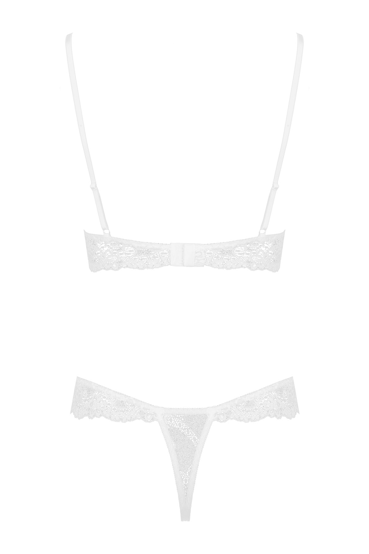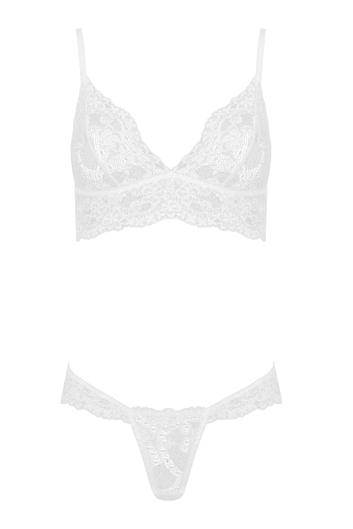 Dessous-Set aus weißer Spitze mit String. Der Bustier-BH ist individuell einstellbar. Aus transparentem Stoff genäht.