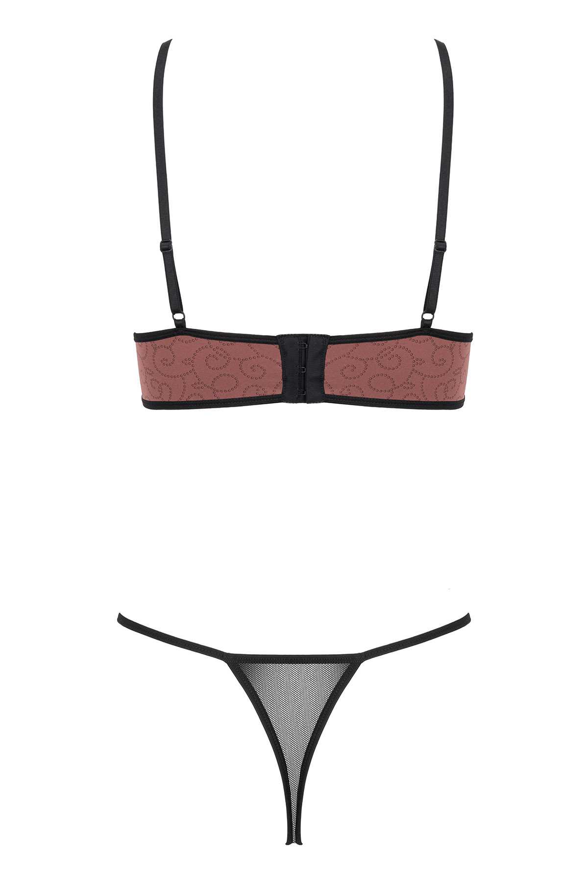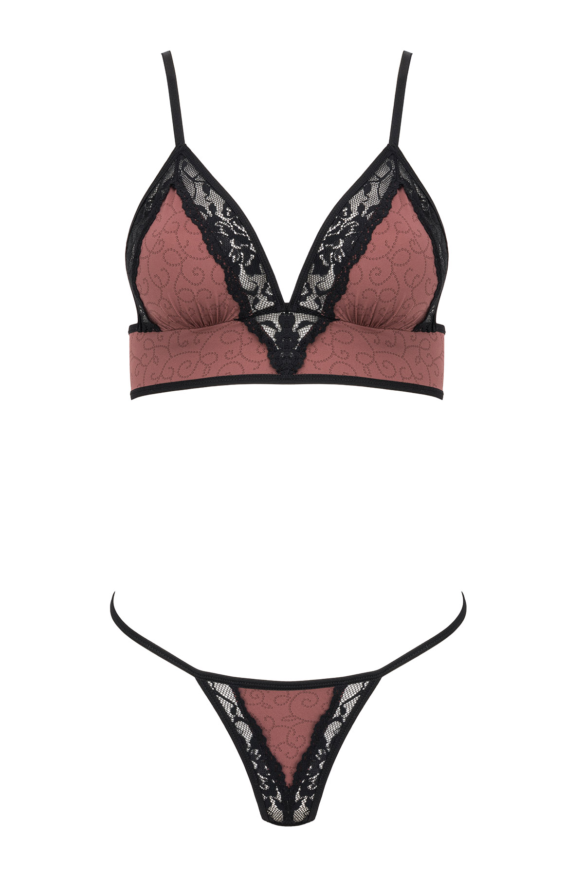 Dessous-Set aus BH und String in violett-schwarz. Verziert mit einem floralen Muster. Die Träger... mehr