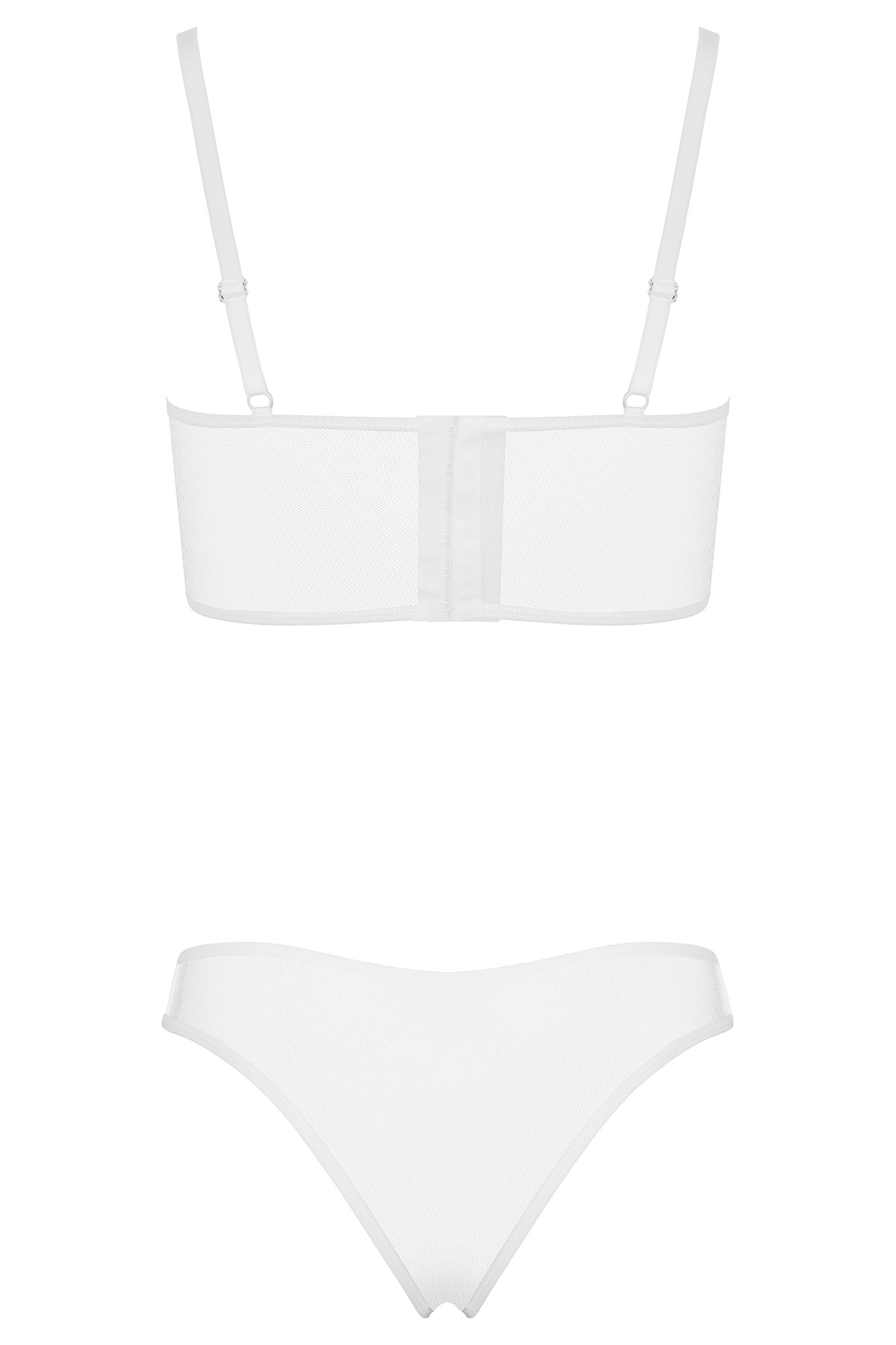 Weißes Bustier-Set aus transparentem Tüll und floraler Spitzenverzierung. Der Bügel-BH hat verstellbare Träger und einen verstellbaren Rückenverschluss. Der Slip ist im gleichen Design.