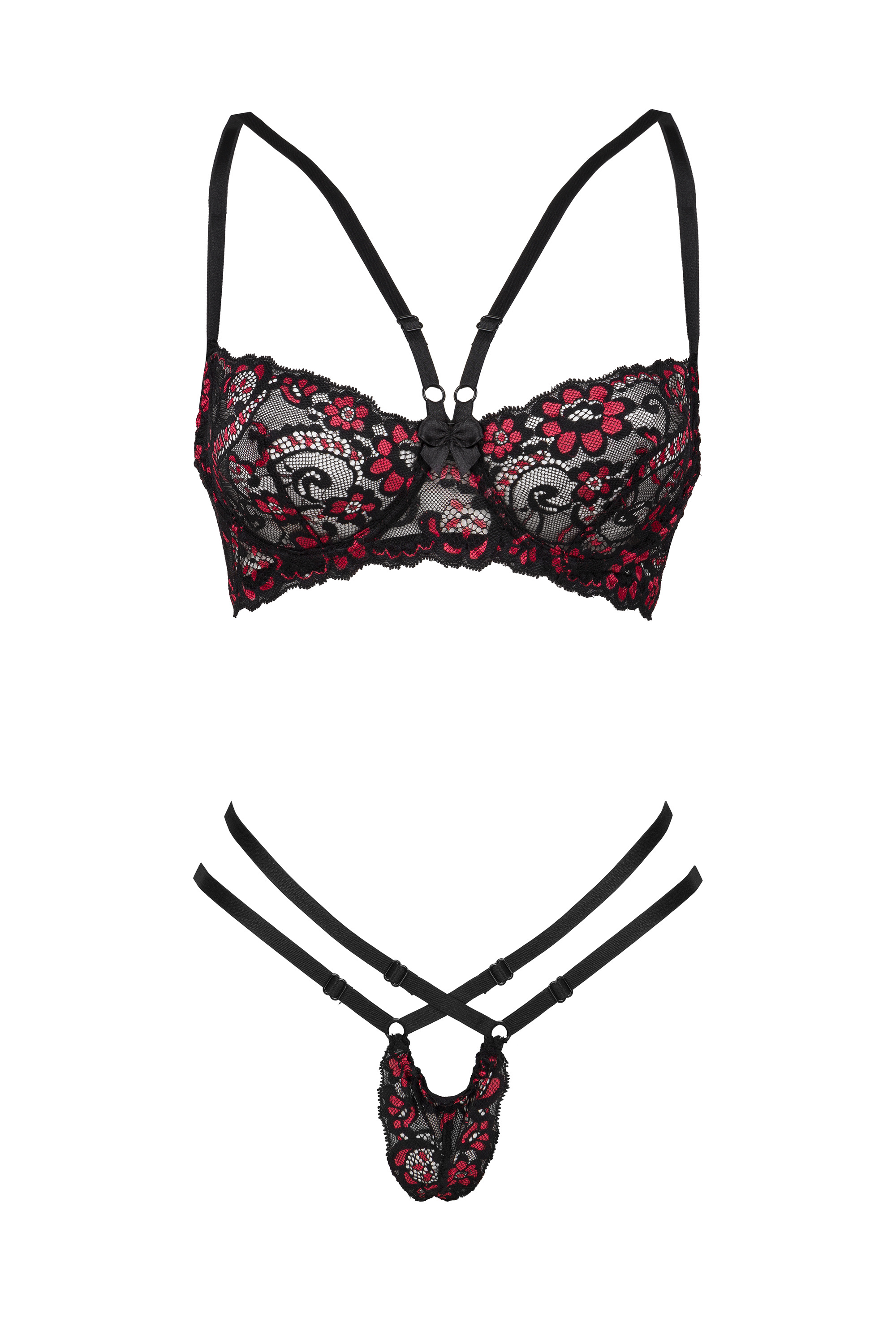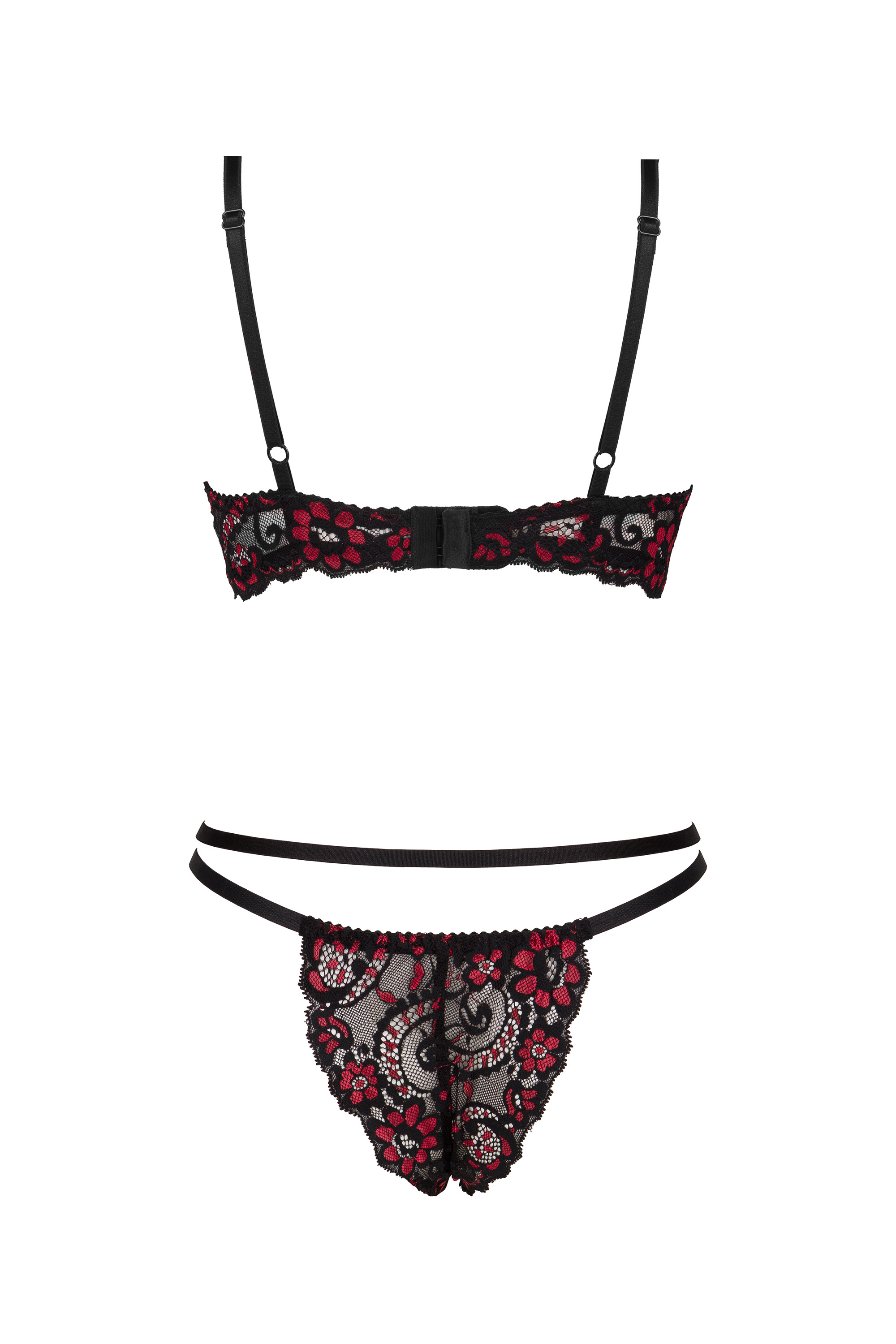 Schwarzes Netz-Set mit roten Blumenmotiven. Der transparente Bügel-BH kann individuell eingestellt werden. Das Riemen-Höschen ist im gleichen Design gefertigt.