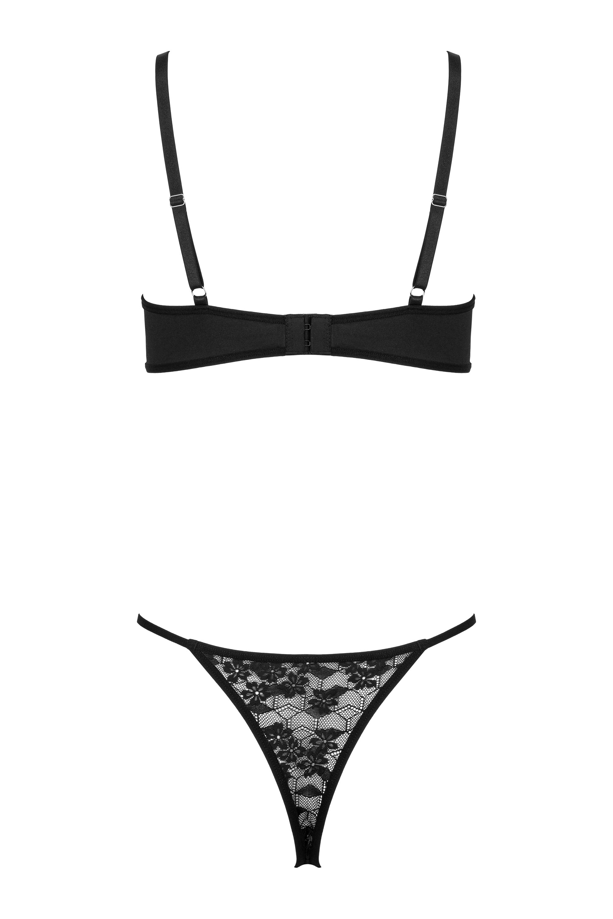Schwarzes Dessous-Set mit Spitze. Der Bügel-BH ist individuell verstellbar. Mit elegantem Blumenmuster.