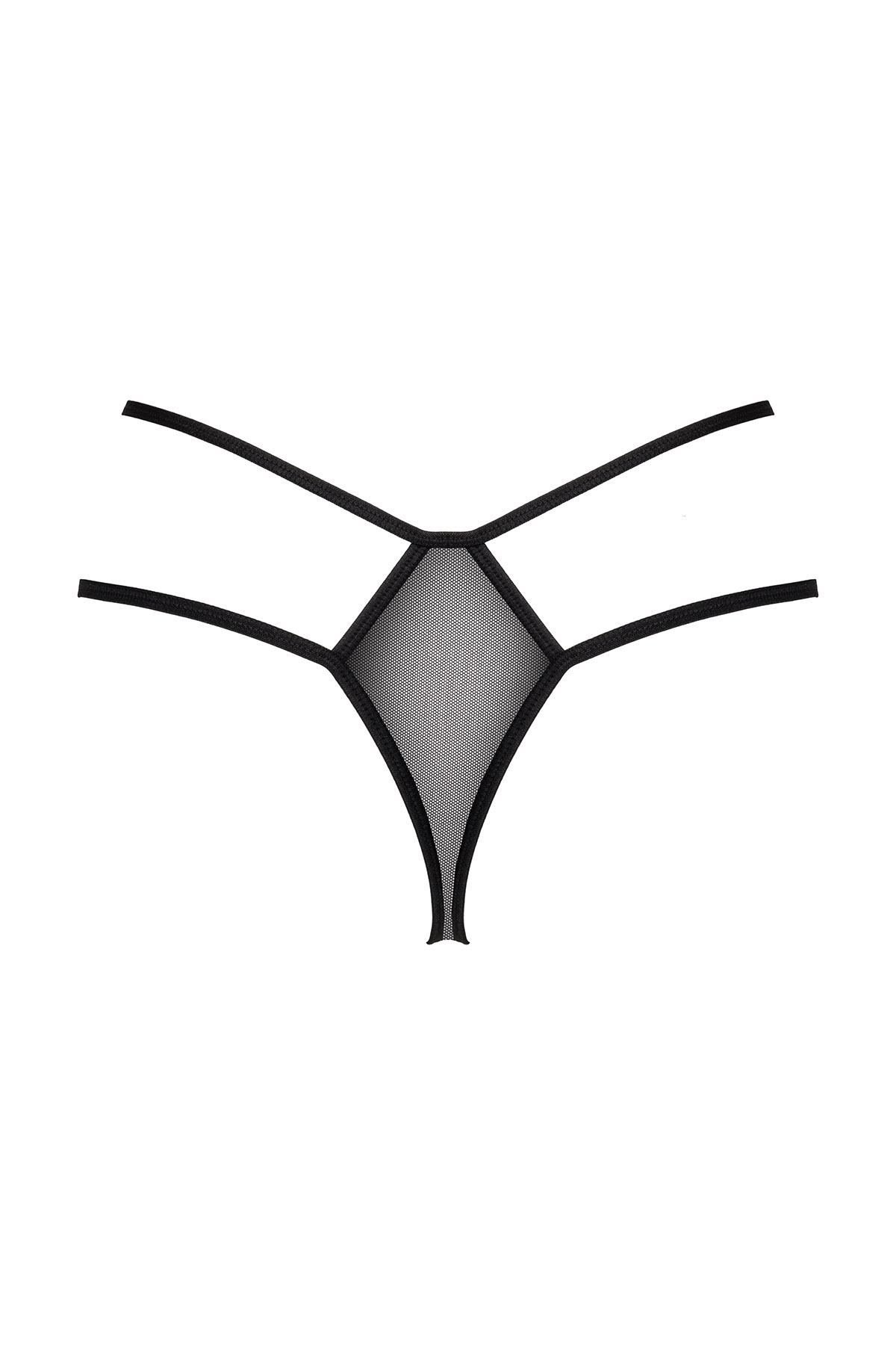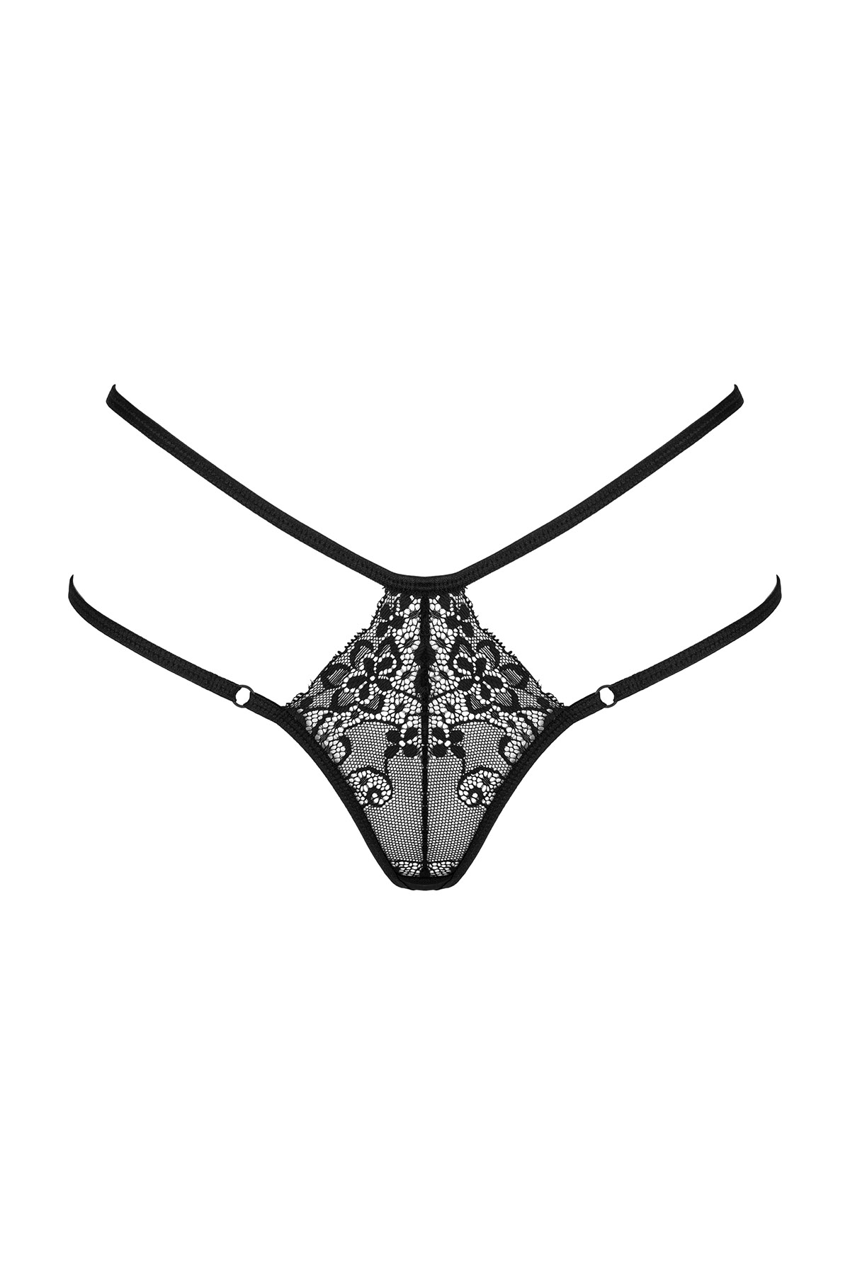 Schwarzer String mit Stretch-Riemen. Mit geblümter Spitze und Tüll. Größen zur Auswahl: S/M, L/XL mehr