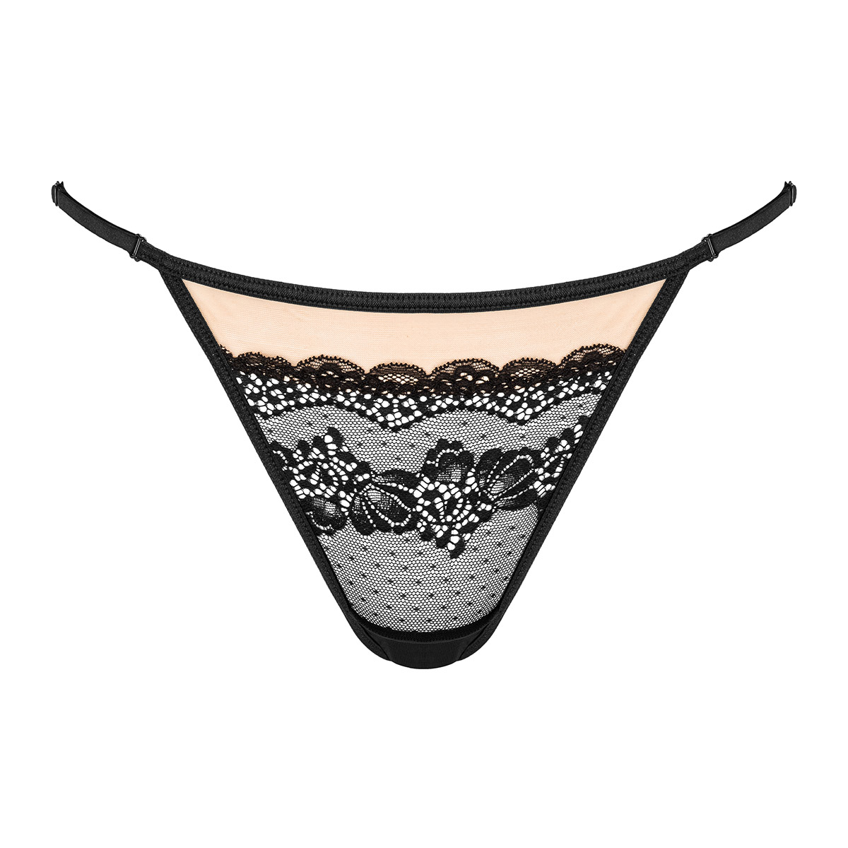 String aus transparentem Tüll und Spitze in schwarz-beige. Die Riemen sind in der Weite verstellbar. Mit Baumwollzwickel