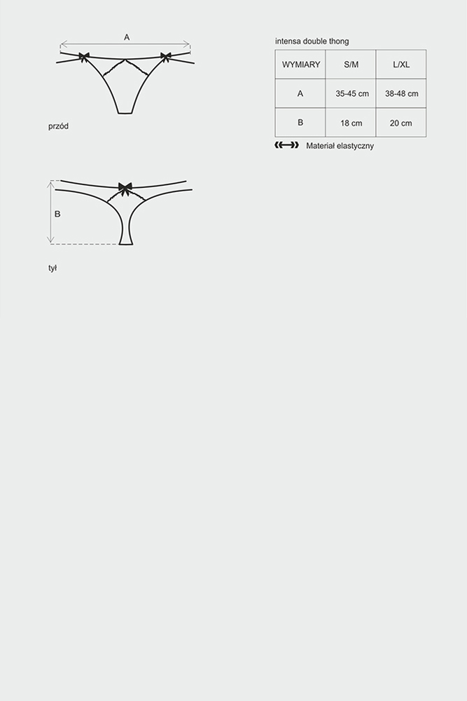 Schwarzer Doppel-String mit Doppelriemchen, die die Hüfte betonen. Mit koketten Schleifen und Spitzenverzierung. Größen zur Auswahl: S/M, L/XL