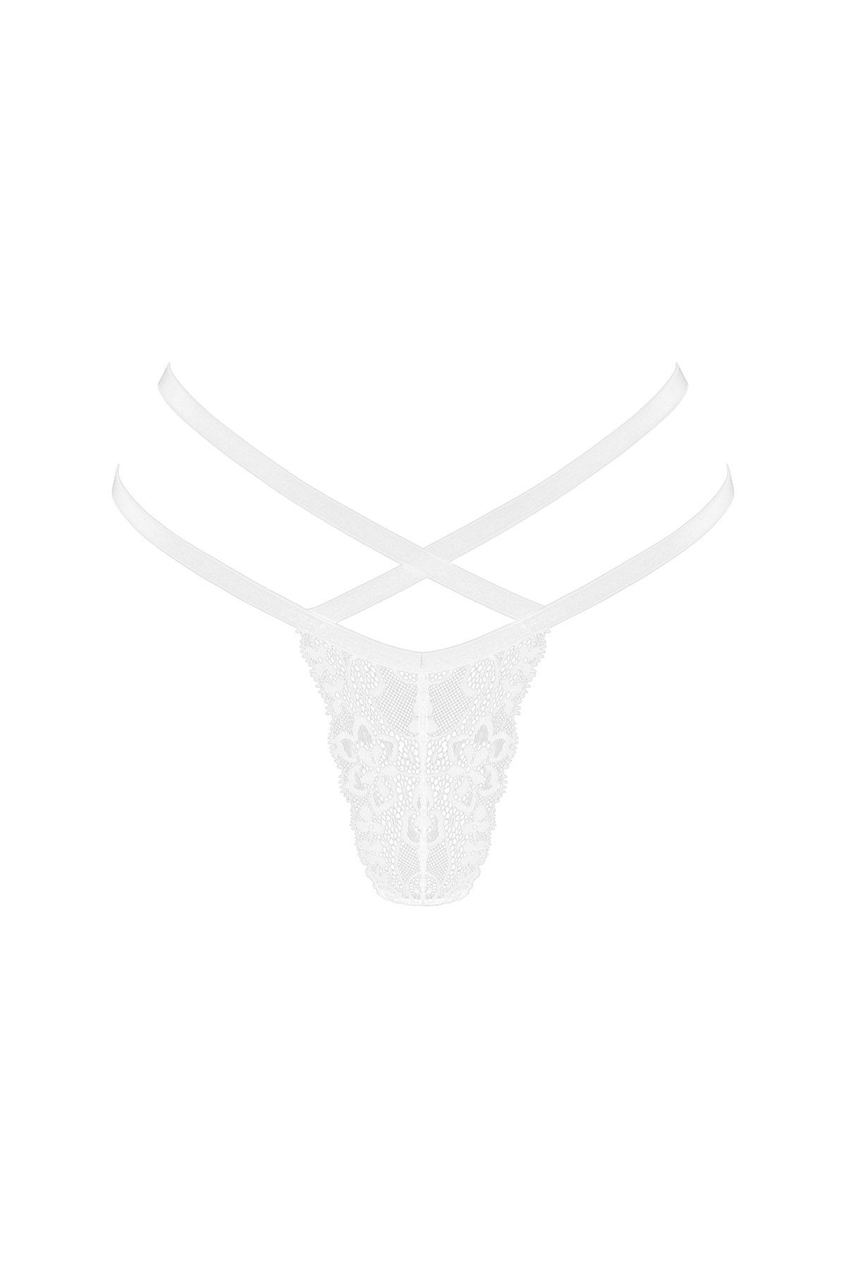 Weißer String mit Stretch-Riemen, die sich hinten kreuzen. Verziert mit geblümter Spitze. Größen zur Auswahl: S/M, L/XL