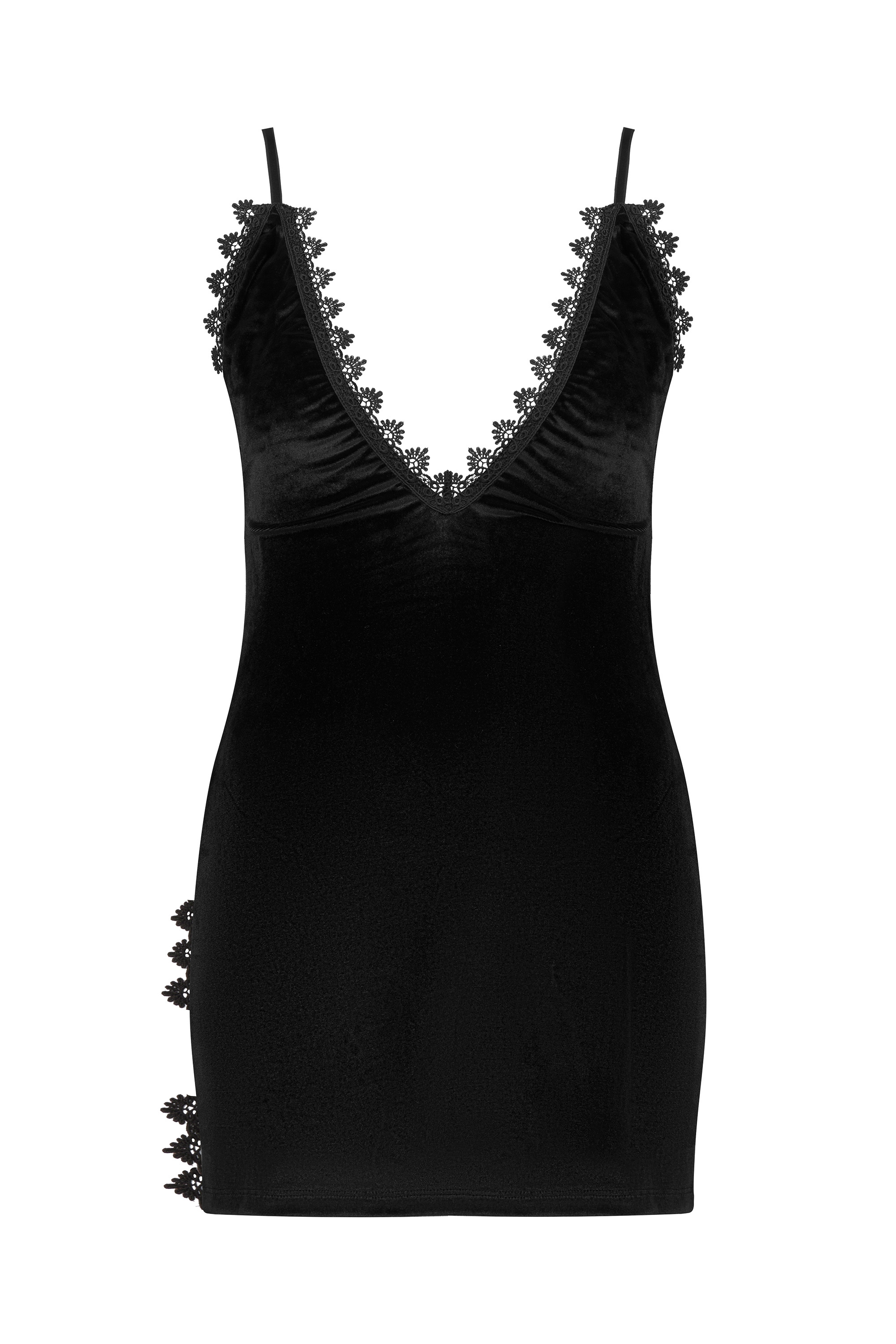 Glänzendes Negligee aus schwarzem Satin mit String. Kurz und körperbetont geschnitten, mit verstellbaren Trägern. Am Dekollete und an den seitlichen Schlitzen mit Guipure-Spitze verziert.