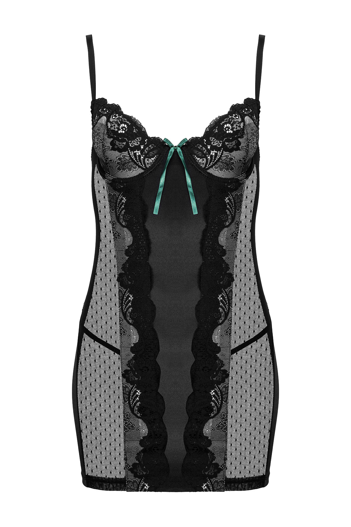 Schwarzes Negligee mit silbergrauer Spitze. Genäht aus glänzendem Stretch-Material, zarter Blütenspitze und transparentem Tüll. Die Cups sind mit Bügeln unterlegt und mit verstellbaren Trägern. Set mit passendem String. Größen zur Auswahl: S/M, L/XL