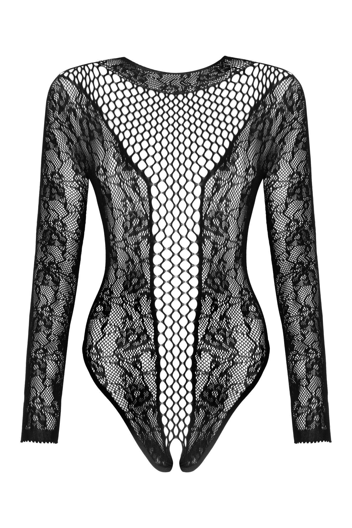 Langärmliger Netzbody aus schwarzem Stretch-Material. Am Schritt offen (ouvert).