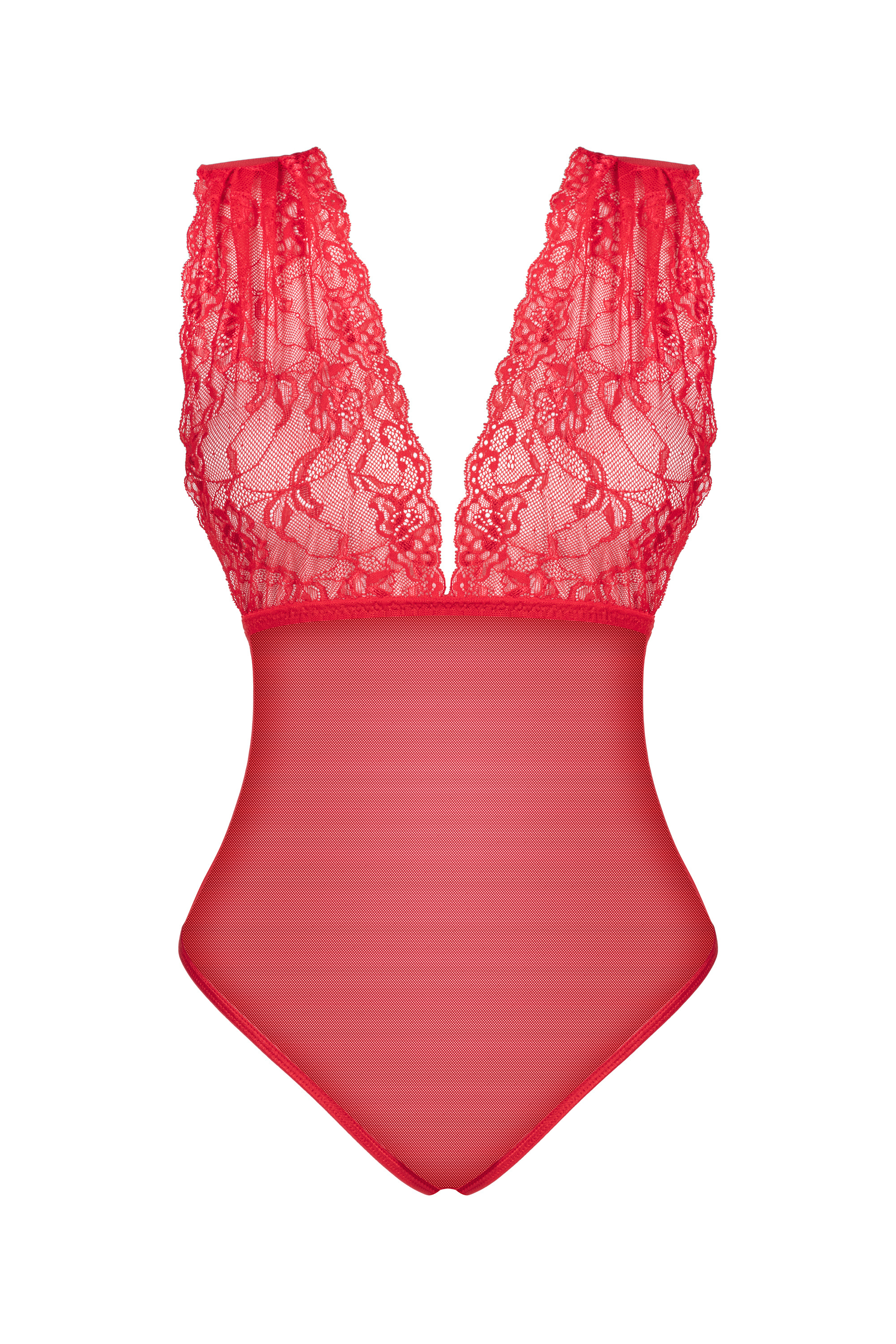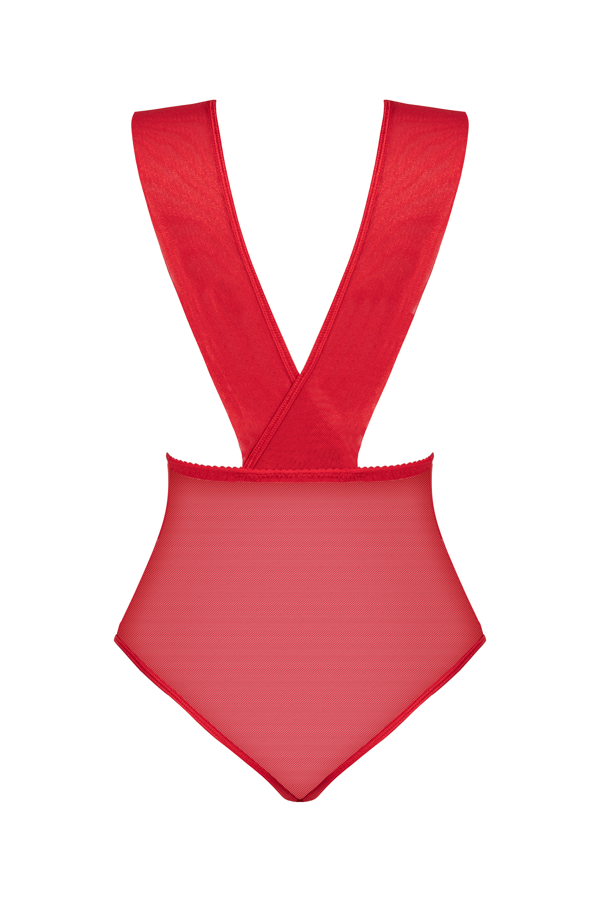 Tüllbody aus rotem, transparentem Material mit breiten Trägern. An der Brust aus floraler Spitze. Am Schritt mit einem Hakenverschluss.