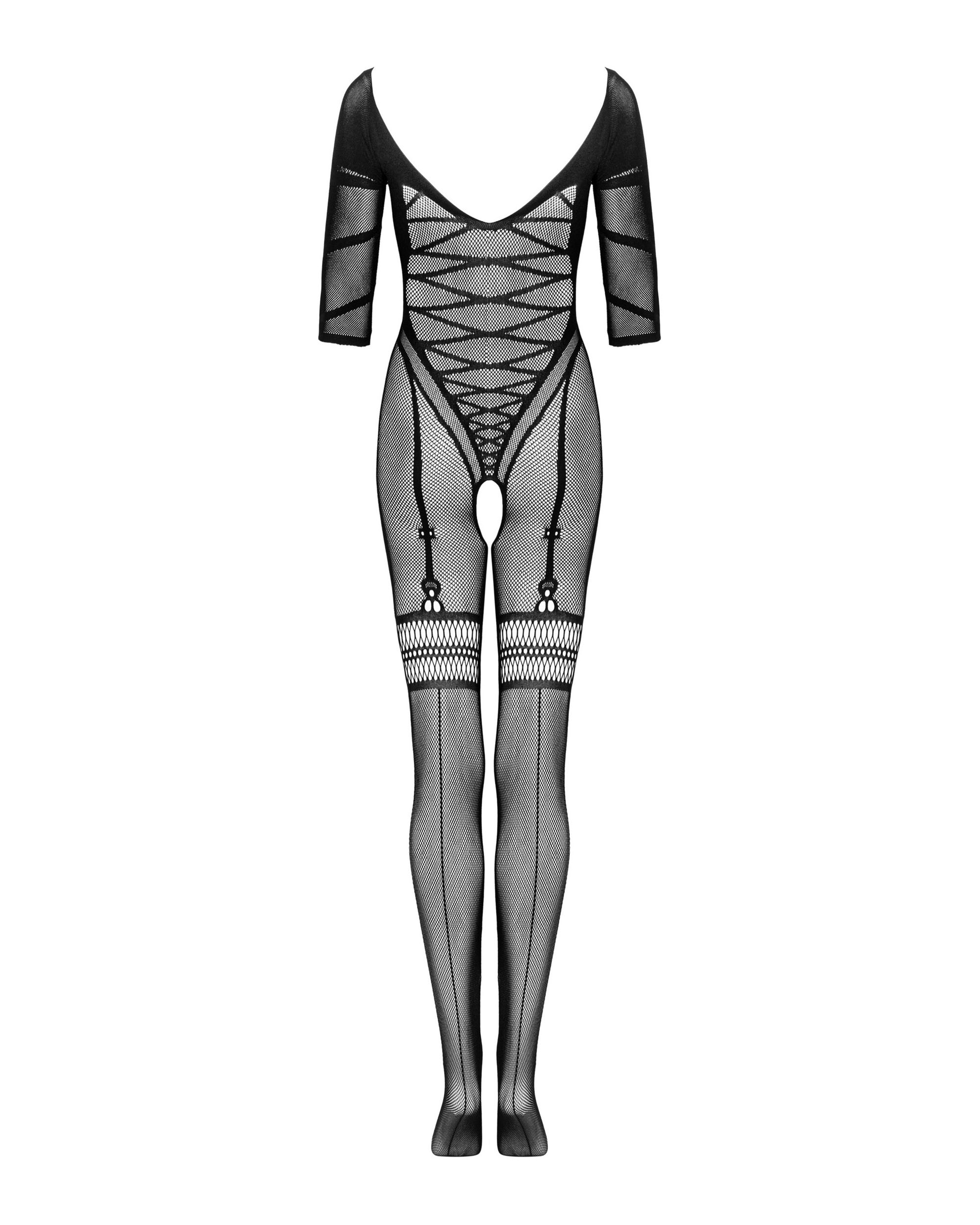 Catsuit in schwarz mit Rundhals-Ausschnitt. Aus elastischem Netz mit Schnür- und Straps-Muster. Im Schritt offen (ouvert).