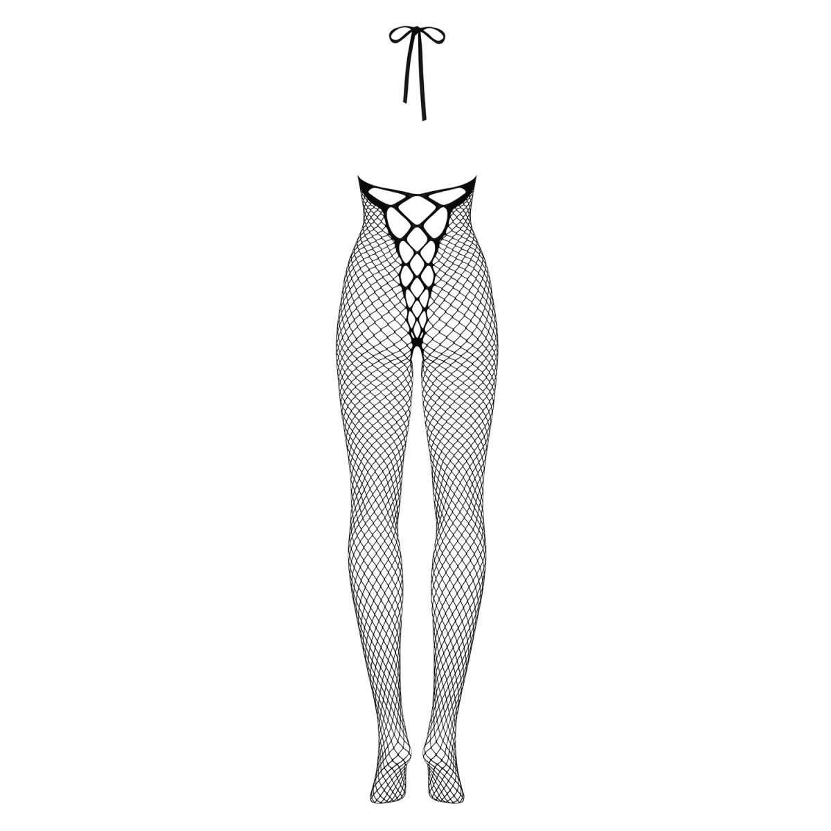 Schwarzer, brustfreier Catsuit in Netz Optik. Mit faszinierenden Lochmuster am oberen Teil. Hinten mit einem tiefen Ausschnitt. Im Schritt offen (ouvert). In Einheitsgröße S-L