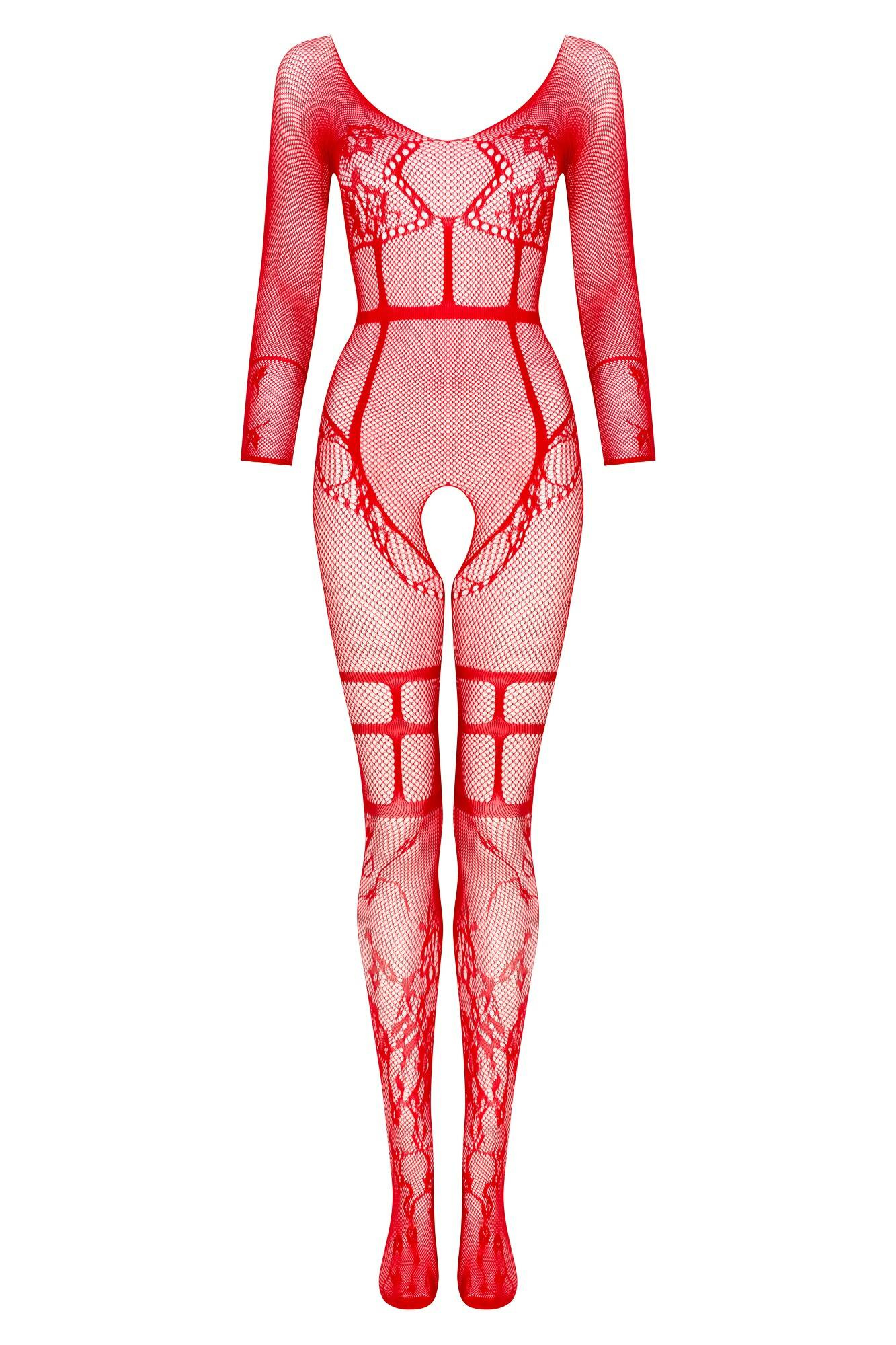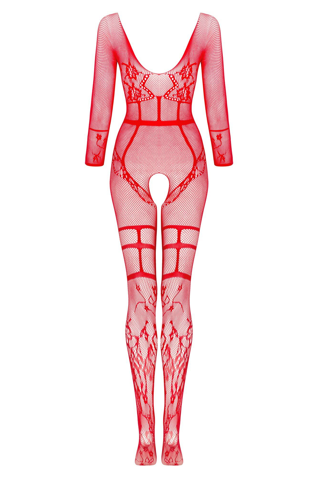 Roter Catsuit aus feinmaschigem Netz mit Blumenmotiv und Zierstreifen. Mit halblangen Ärmeln und einem Rundhalsausschnitt.