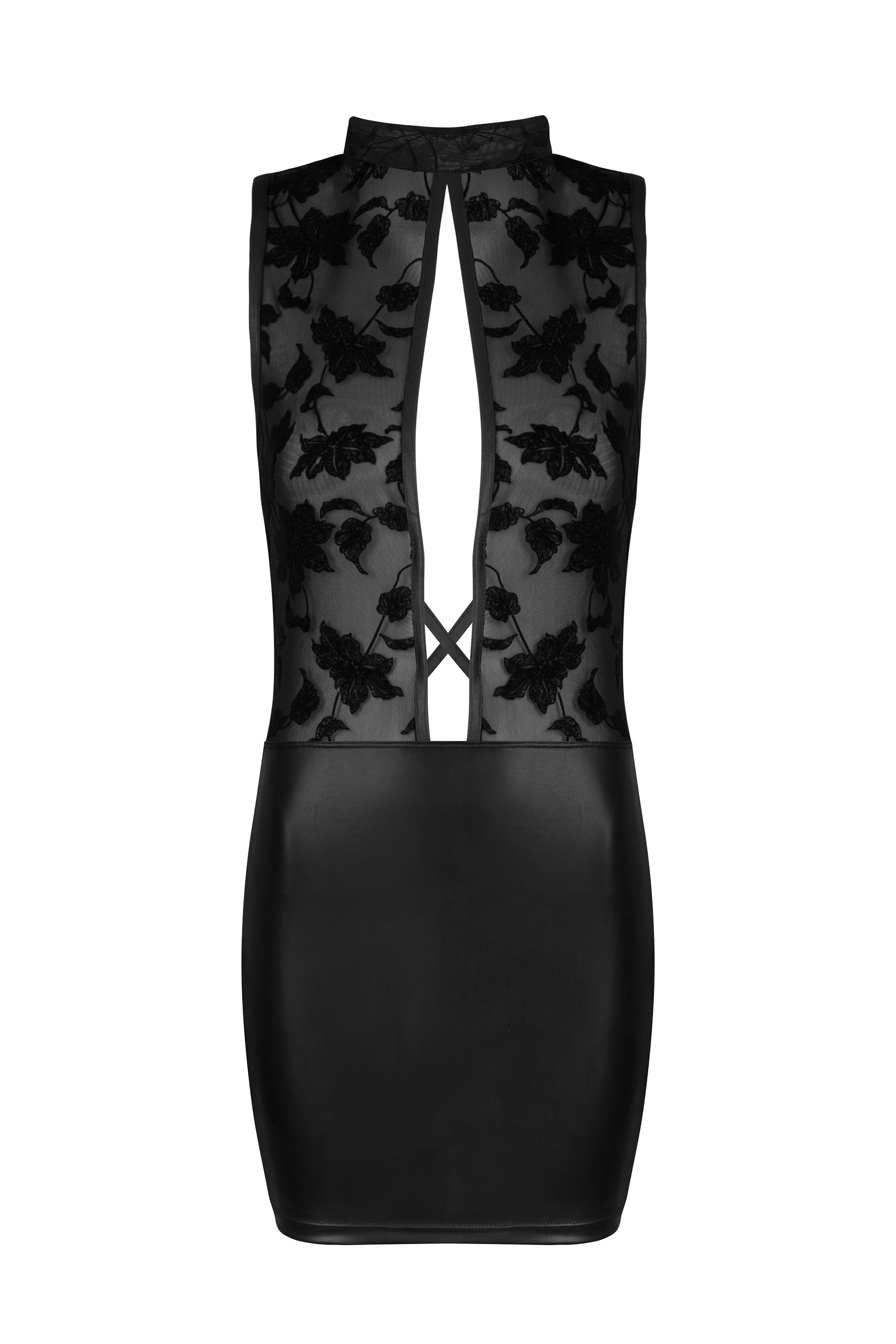 Kleid in schwarz aus transparentem Tüll mit Blumenmotiv. Mit tiefem Ausschnitt vorne und am Rücken.Der untere Teil ist aus Latexlook-Material.