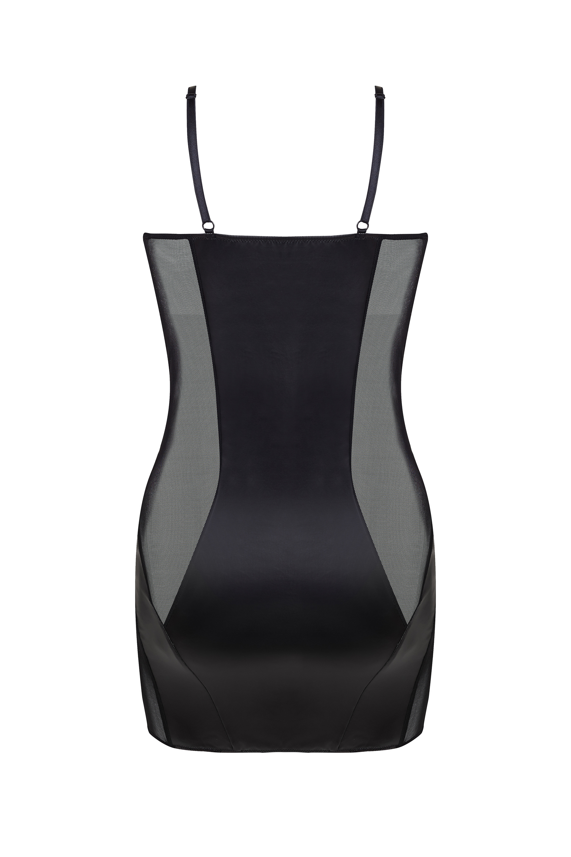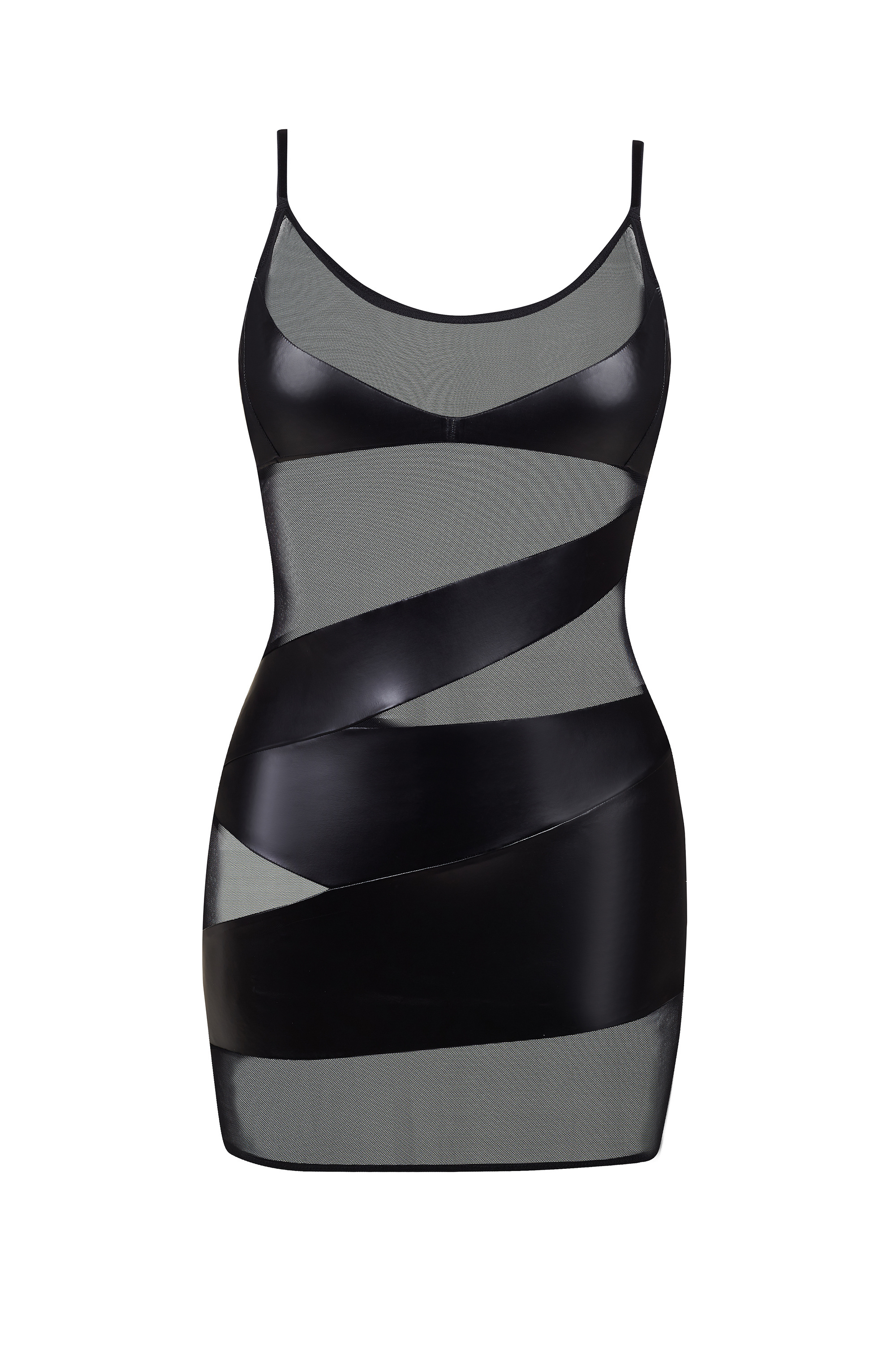 Schwarzes Kleidchen aus transparentem Tüll und Kunstleder. An den Trägern individuell verstellbar. Im Set ein passender String. Größen zur Auswahl: S/M, L/XL