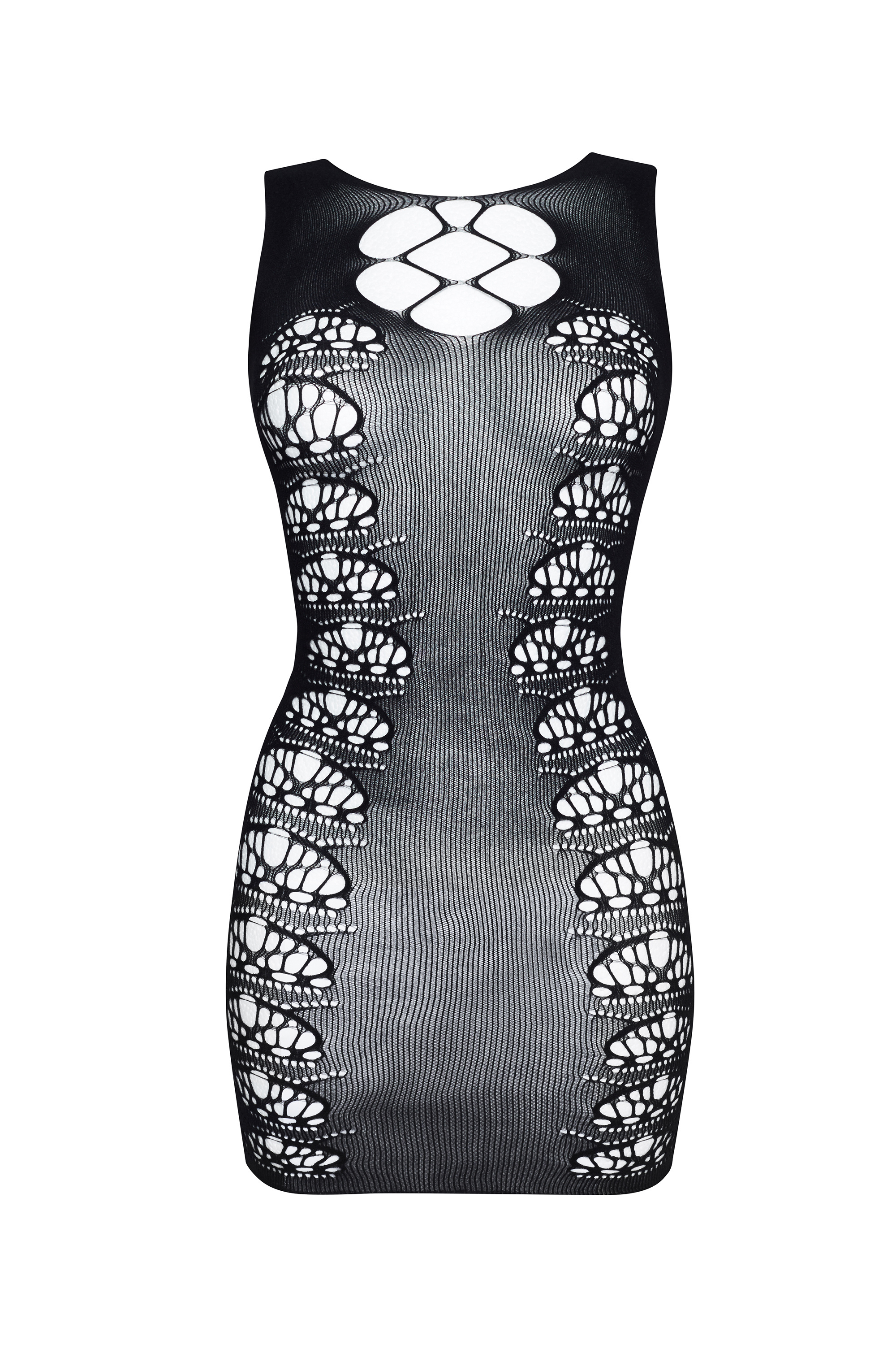 Netzkleid aus schwarzem, elastischem Netz. Aus elastischem, gemustertem Material genäht. In Einheitsgröße: S-L