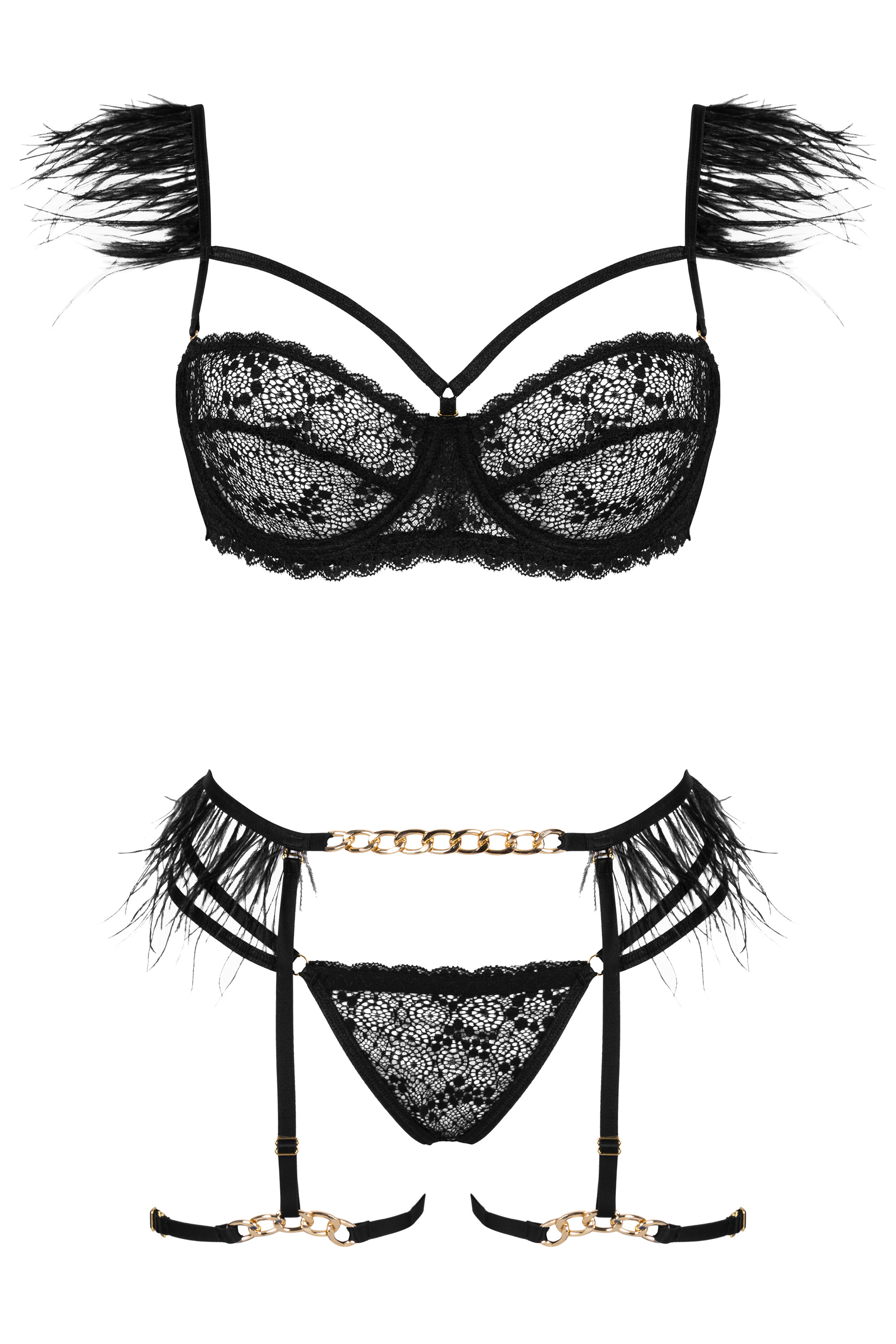 Schwarzes Dessous-Set aus transparentem Stoff. Mit goldfarbenen Metallketten am Hüftgürtel und an den Oberschenkelbändern. Der Bügel-BH und der Gürtel sind mit Federn verziert. Inklusive String im gleichen Design.