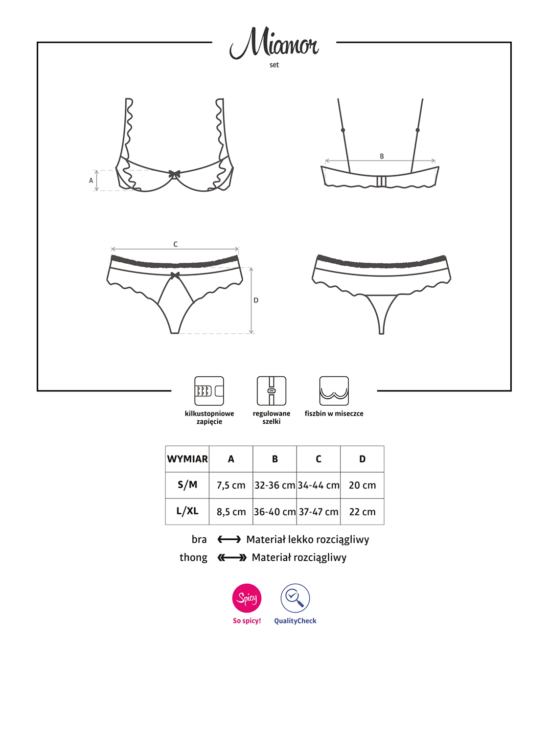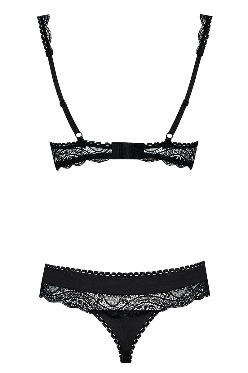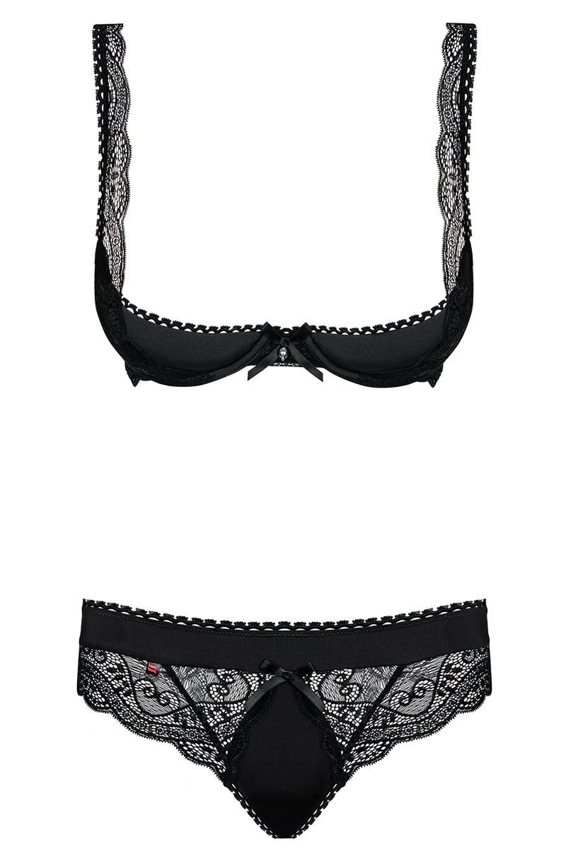 Schwarzes Brustfrei-Set aus Halb-BH mit Bügel-Cups und herausnehmbaren Push-up-Polstern. Mit einer Satinschleife und leicht verstellbaren Trägern sowie Hakenverschluss auf der Rückseite. Elegantes Höschen aus elastischem Material mit Spitzenverzierungen. Größen zur Auswahl: S/M, L/XL