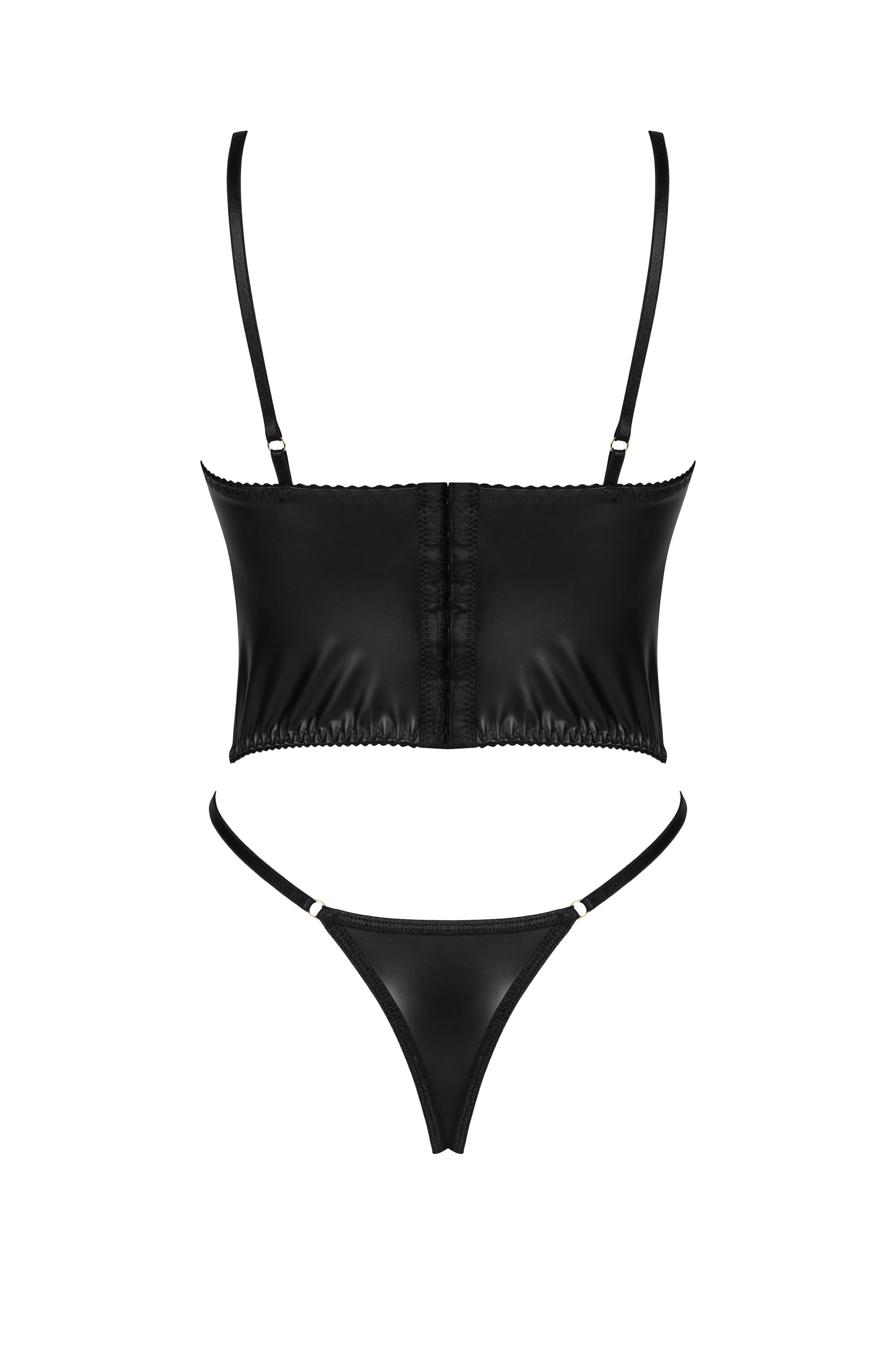 Wetlook-Set in schwarz mit Bügel-Top und String. Das Bustier ist mehrfach verstellbar und hat Zierschnürungen an der Vorderseite.