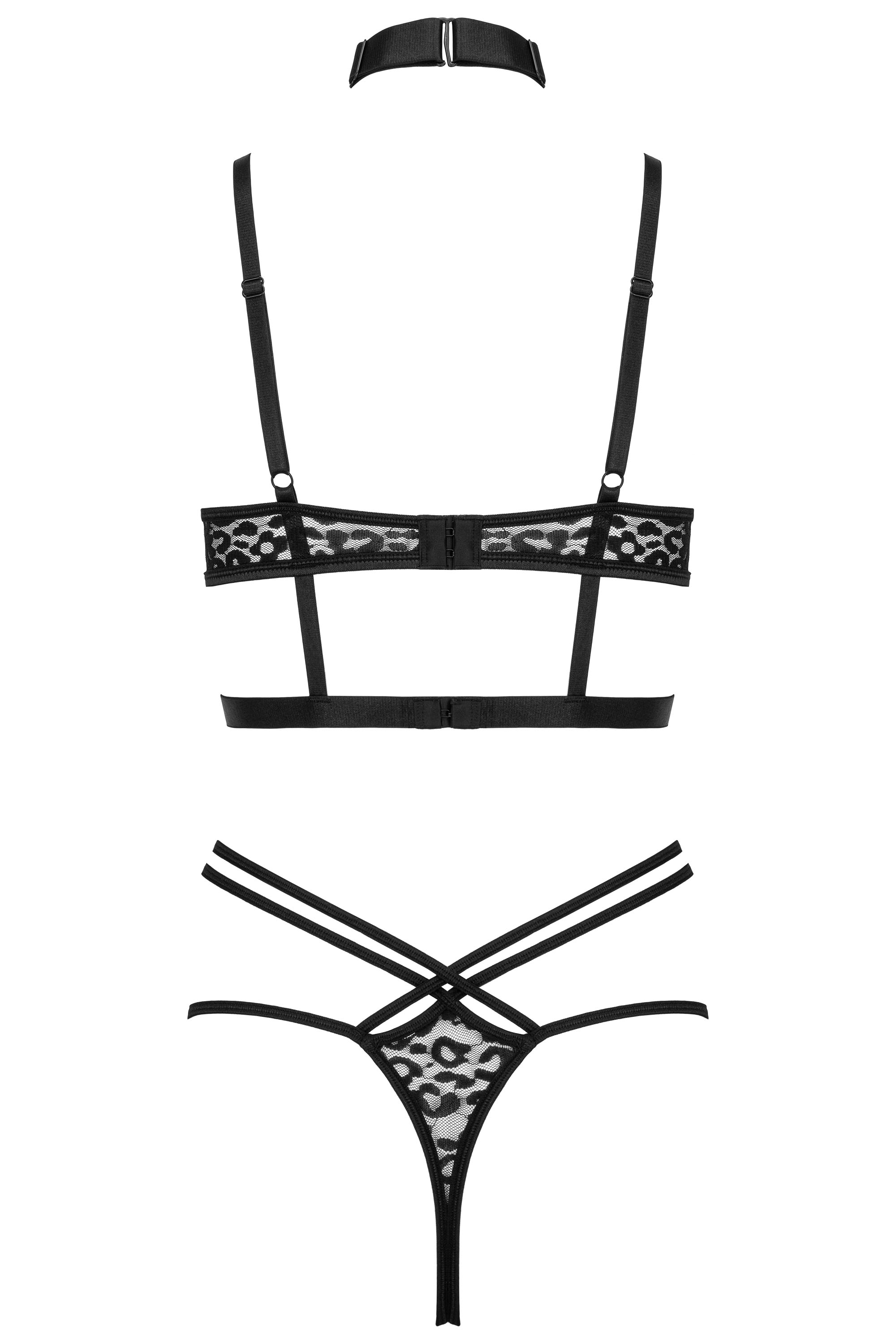 Reizwäsche-Set aus schwarzem, transparentem Material. Am Bügel-BH ist ein Halsband angenäht, das individuell angepasst werden kann. Mit String im gleichen Style mit elastischen Riemen.