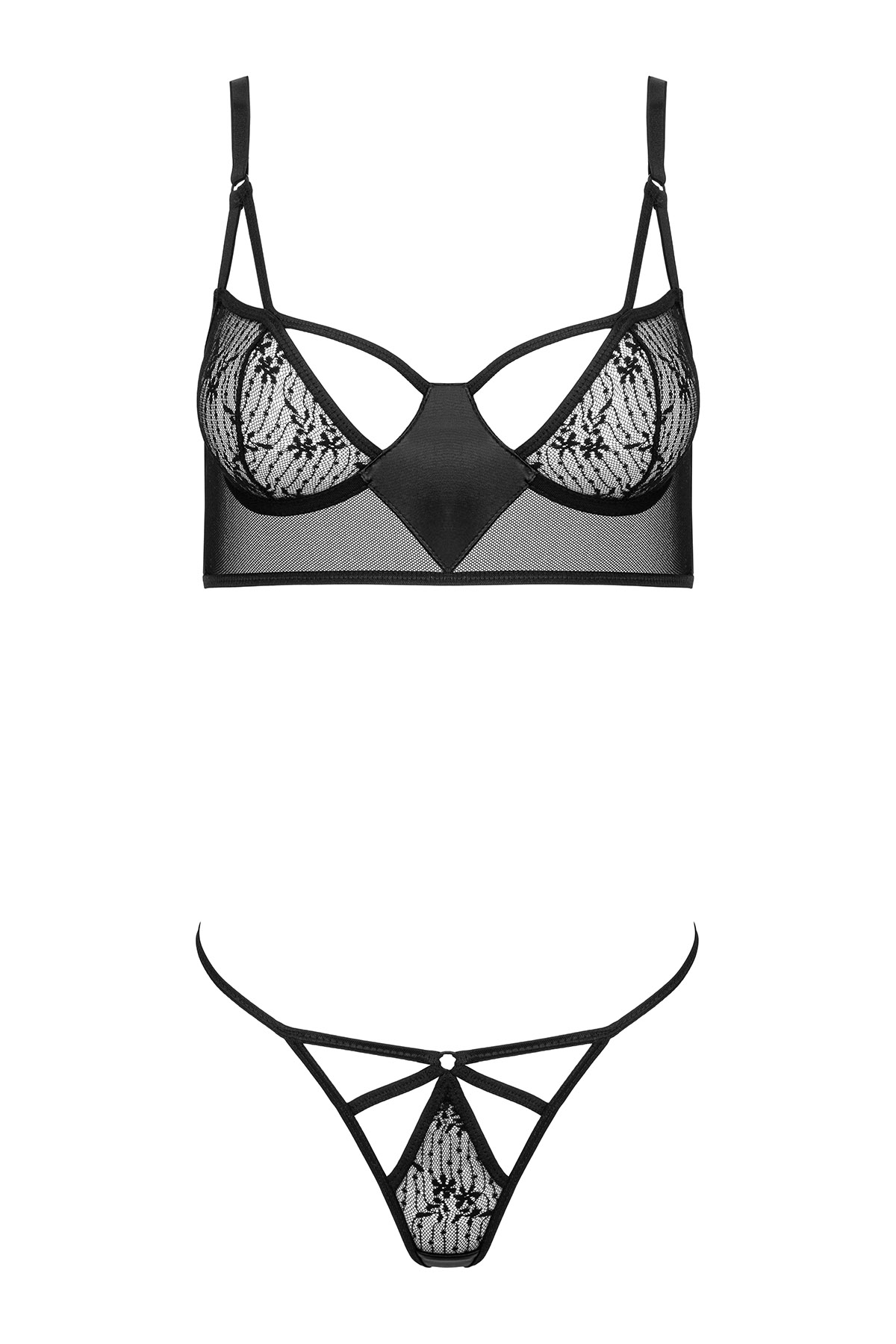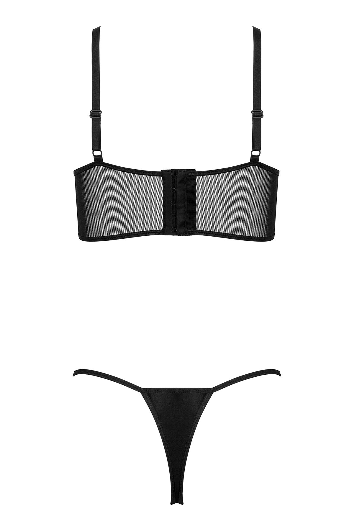 Schwarzes Bustier-Set aus transparentem Material mit Blumenmotiv. Der Bügel-BH hat einen verstellbaren Rückenverschluss und verstellbare Träger. Der String ist hinten aus Wetlook-Material. Größen zur Auswahl: S/M, L/XL
