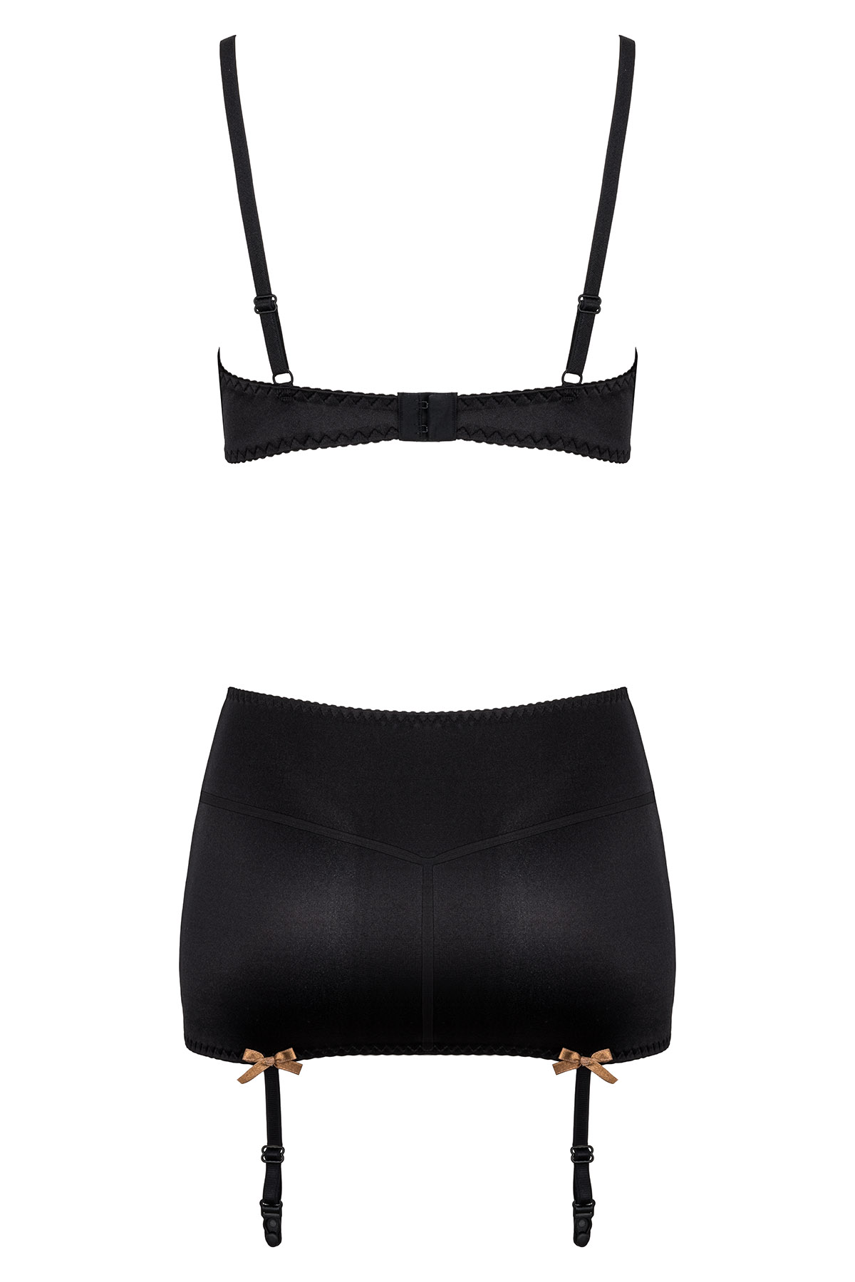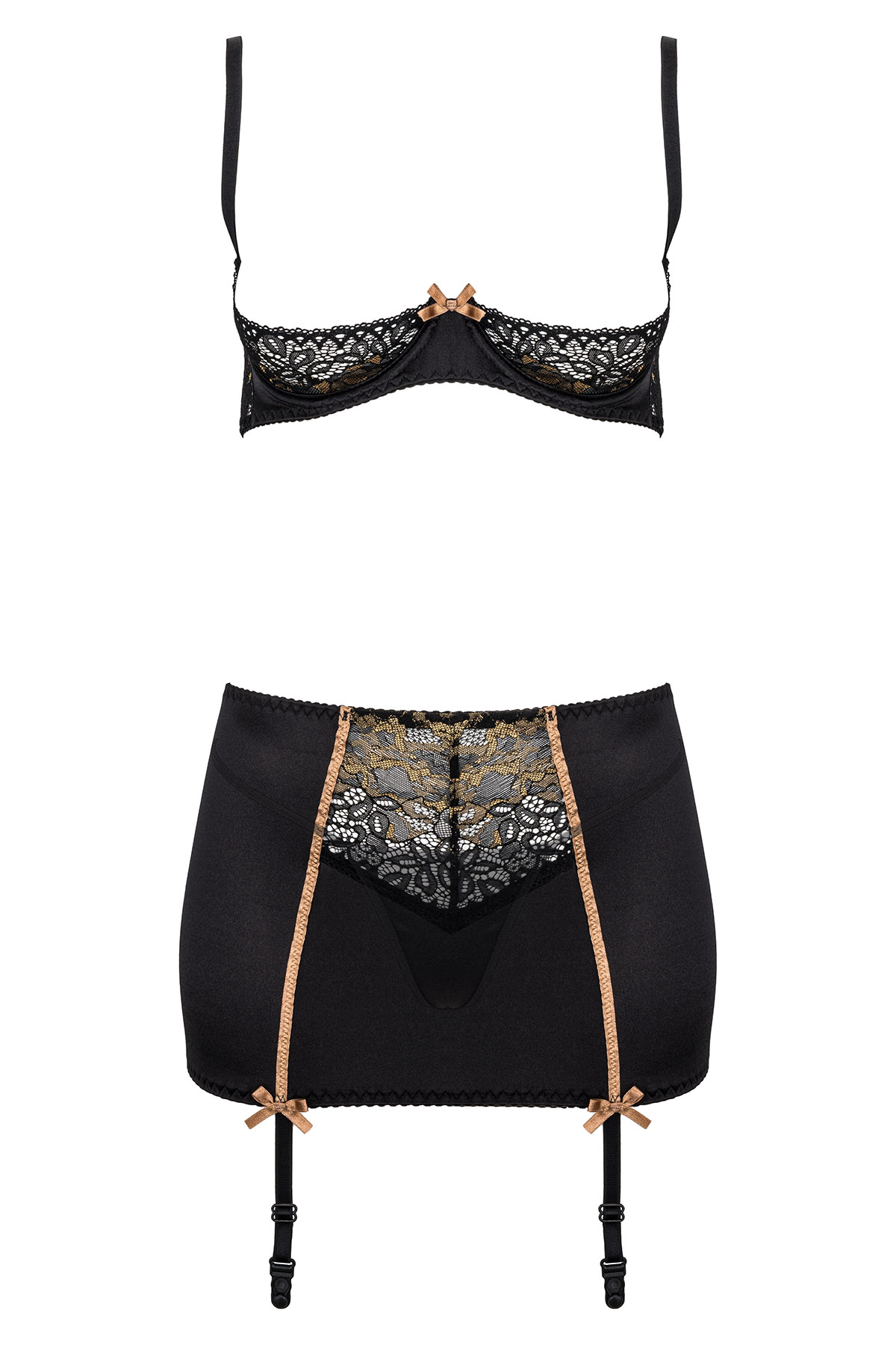 Schwarzes Ouvert-Set mit bronzefarbener Spitze. Hebe-BH mit verstellbaren Trägern und zweifachem Rückenverschluss. Enganliegender und figurbetonter breiter Hüftgürtel mit verstellbaren Strapshaltern. Set mit passendem String. Größen zur Auswahl: S/M, L/XL