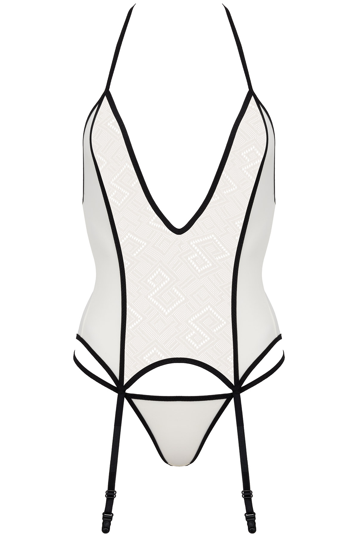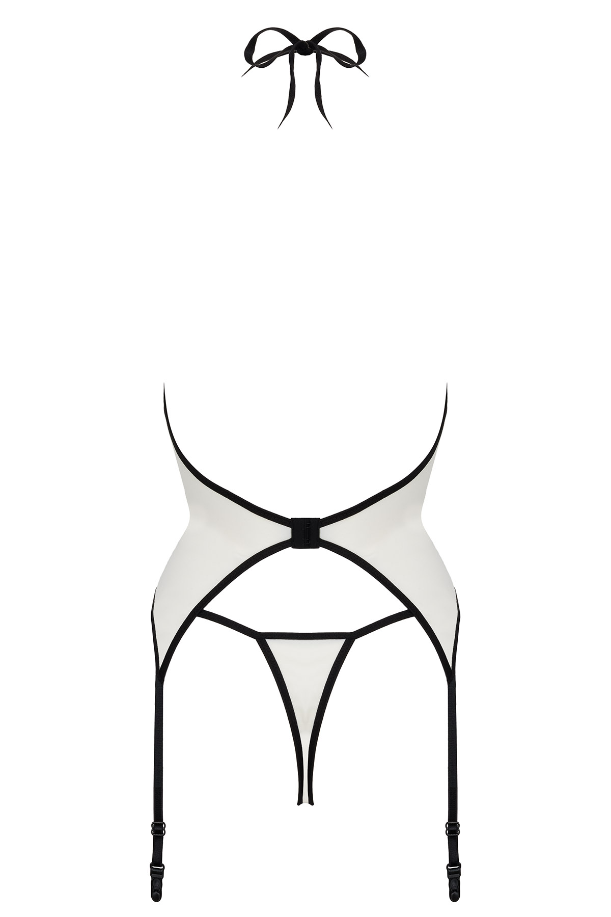 Beigefarbenes Strapshemd aus transparentem Stretch-Material mit geometrischem Muster vorne und freiem Rücken. Neckholder, Rückenverschluss und Strumpfhalter sind verstellbar. Inklusive passenden String, ohne Strümpfe.