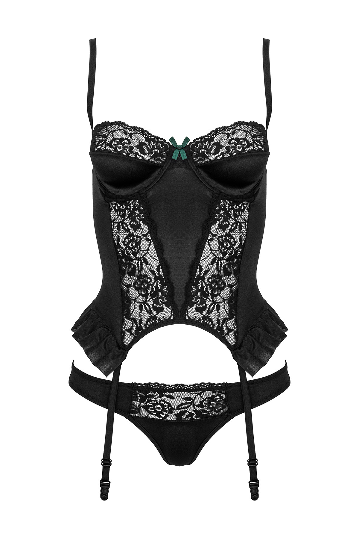 Schwarze Corsage aus glänzendem Stretch-Material und zarter Blütenspitze. Mit unterlegten Bügel-Cups und verstellbaren Trägern. Verstellbare und abnehmbare Straps-Strumpfhalter. Im gleichen Design der String. Größen zur Auswahl: S/M, L/XL, XXL
