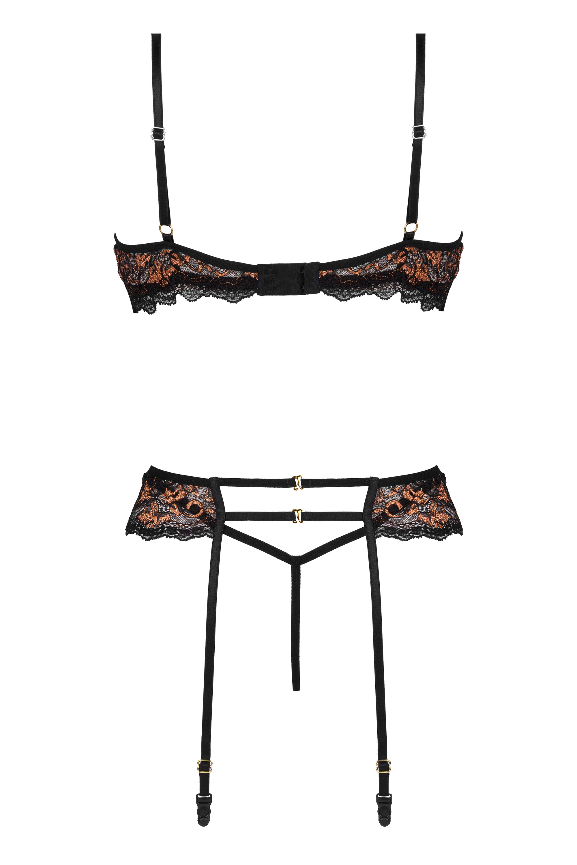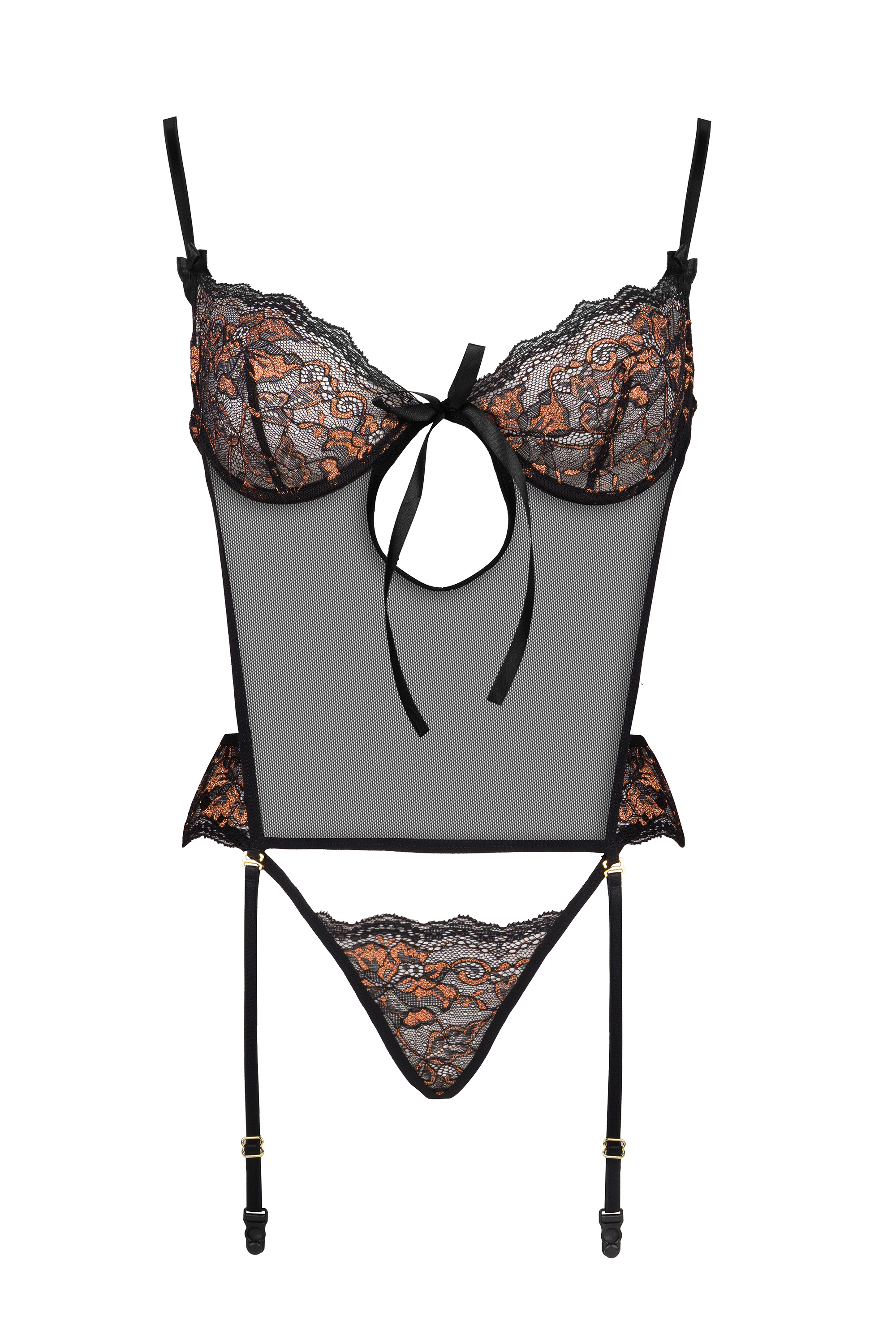 Corsage aus schwarzem, transparentem Tüll mit Spitze. Mit verstellbaren Trägern und Bügel-Cups. Inklusive passendem String, ohne Strümpfe.