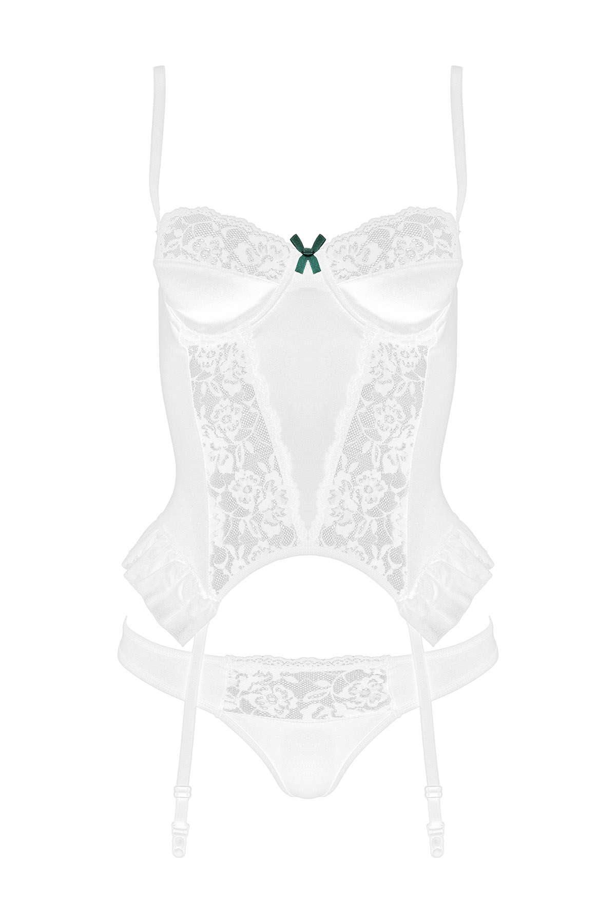 Weiße Corsage aus elastischem Satin verziert mit zarter Blütenspitze. Mit verstellbaren Trägern und unterlegten Bügel-Cups. Verstellbare und abnehmbare Strumpfhalter. Im gleichen Design ein passender String. Größen zur Auswahl: S/M, L/XL, XXL