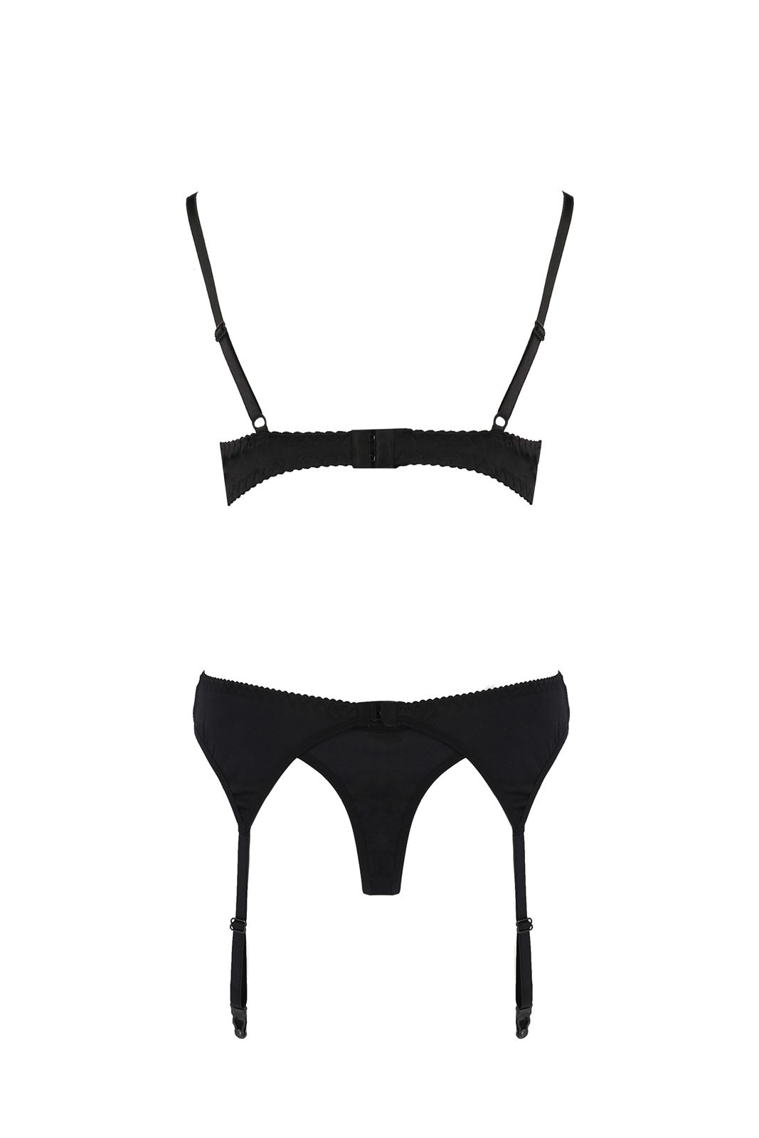Straps-Set in schwarz aus glänzendem Satin kombiniert mit zarter Spitze. BH mit unterlegten Bügel-Cups, zweifachem Rückenverschluss und verstellbaren Trägern. Strumpfgürtel mit verstellbaren Strumpfhaltern. Hinten mit zweifachem Häkchenverschluss. Im gleichem Design ein passender String. Größen zur Auswahl: S/M, L/XL, XXL