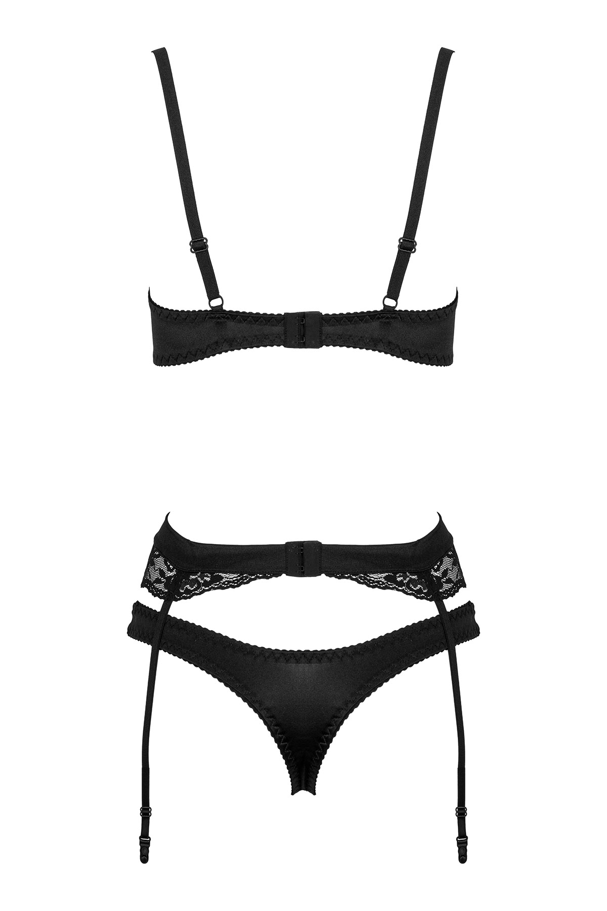 Schwarzes Straps-Set aus glänzendem Stretch-Material und Spitze. Offener BH mit unterlegten Bügel-Cups, verstellbaren Trägern und zweifachem Rückenverschluss. Strapsgürtel mit verstellbaren Strumpfhaltern und Rückenverschluss. Im gleichen Design ein passender String.