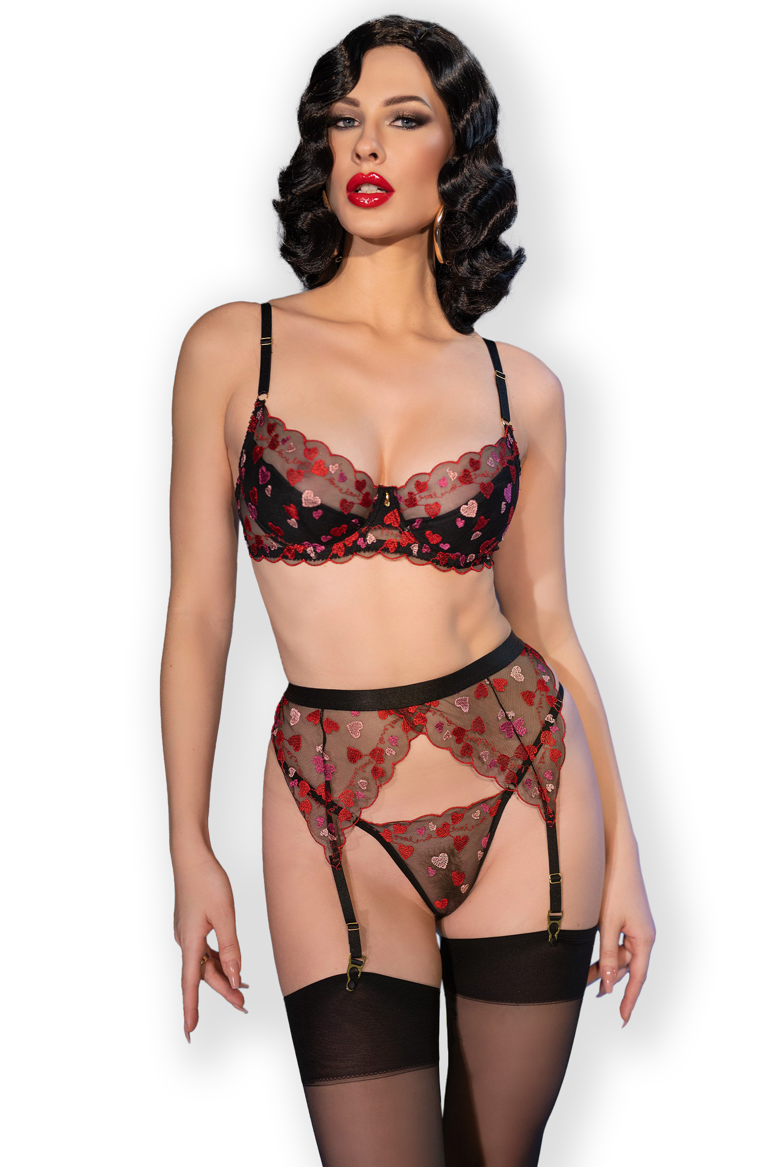 Schwarzes Strapse-Set aus transparentem Tüll mit Herzchen-Motiven. Bügel-BH und Strumpfgürtel sind verstellbar. Im Set mit String im gleichen Style und Strapsstrümpfen.