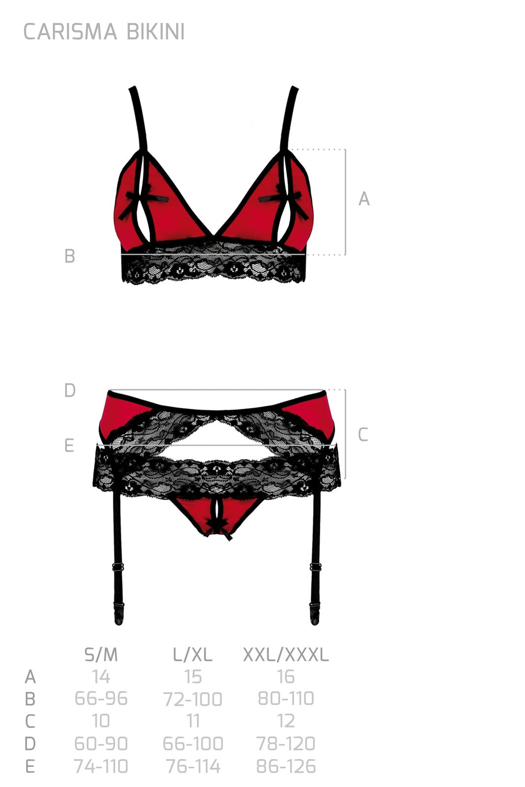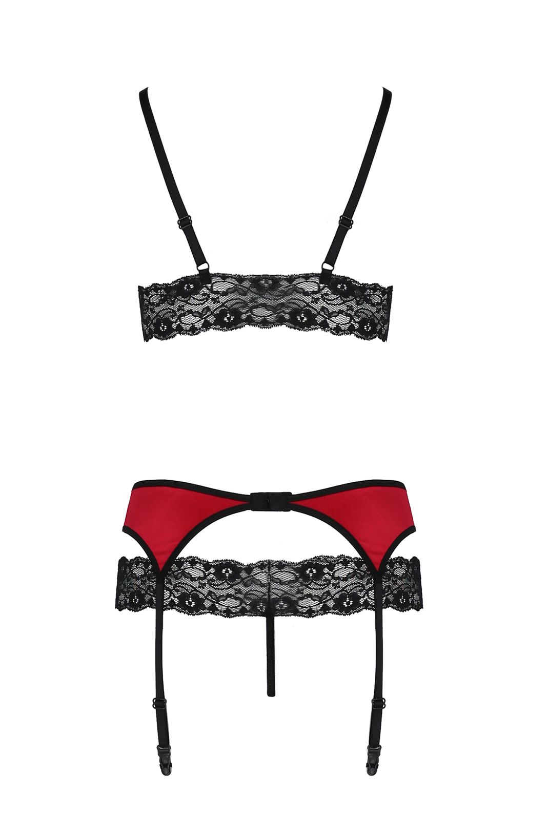 Straps-Set in schwarz-rot aus Spitze und Stretch-Material. BH und Strapshalter haben verstellbare Träger. Der Soft BH ist mit kleinen Öffnungen und Zierschleifen versehen. Das Set umfasst BH, Strapshalter und einen passenden String. Ohne Strümpfe. Größen zur Auswahl: S/M, L/XL