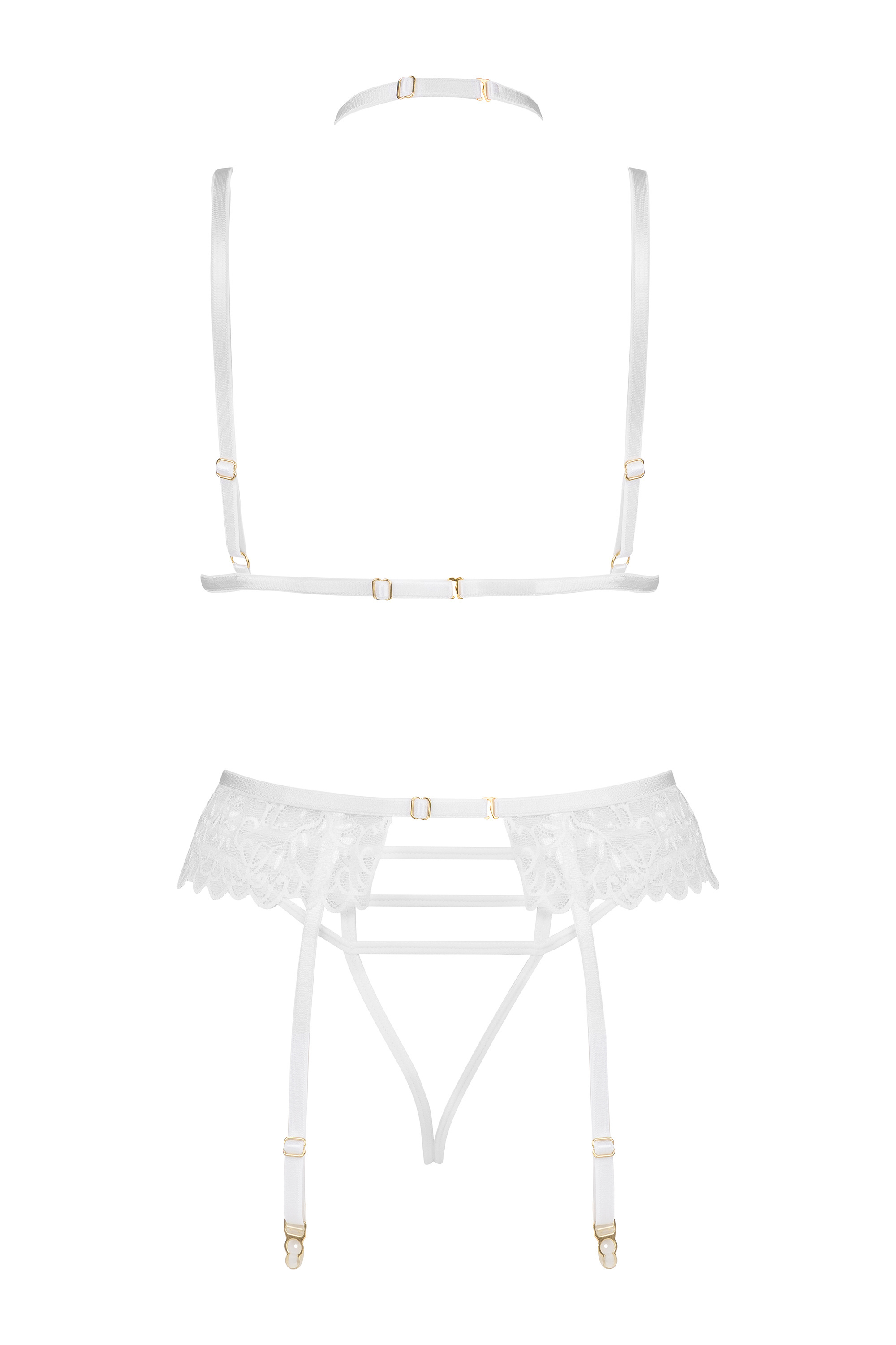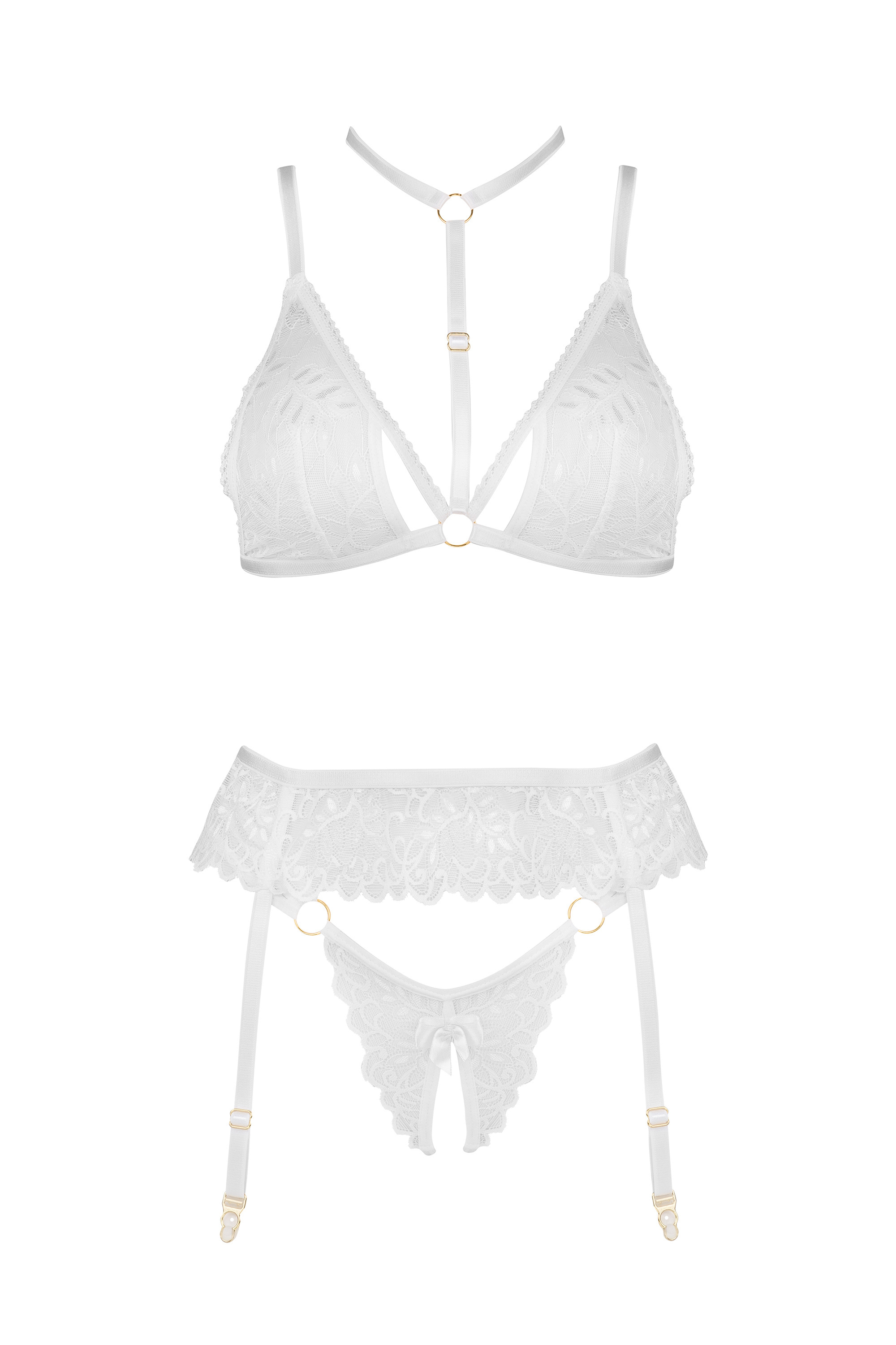 Weißes Dessous-Set aus Spitze. Der BH und der Strumpfgürtel sind individuell einstellbar. Im Set ein passender Ouvert-String, ohne Strümpfe.