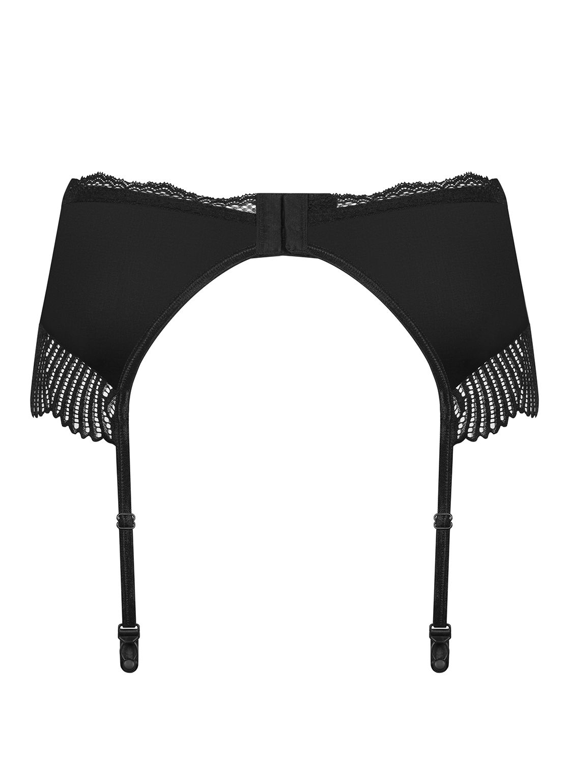 Schwarzer Strapsgürtel mit Spitze in einem modernen Style. Die festgenähten Strapshalter sind verstellbar. Auf der Rückseite mit einem verstellbaren Hakenverschluss. Ohne Strümpfe und String