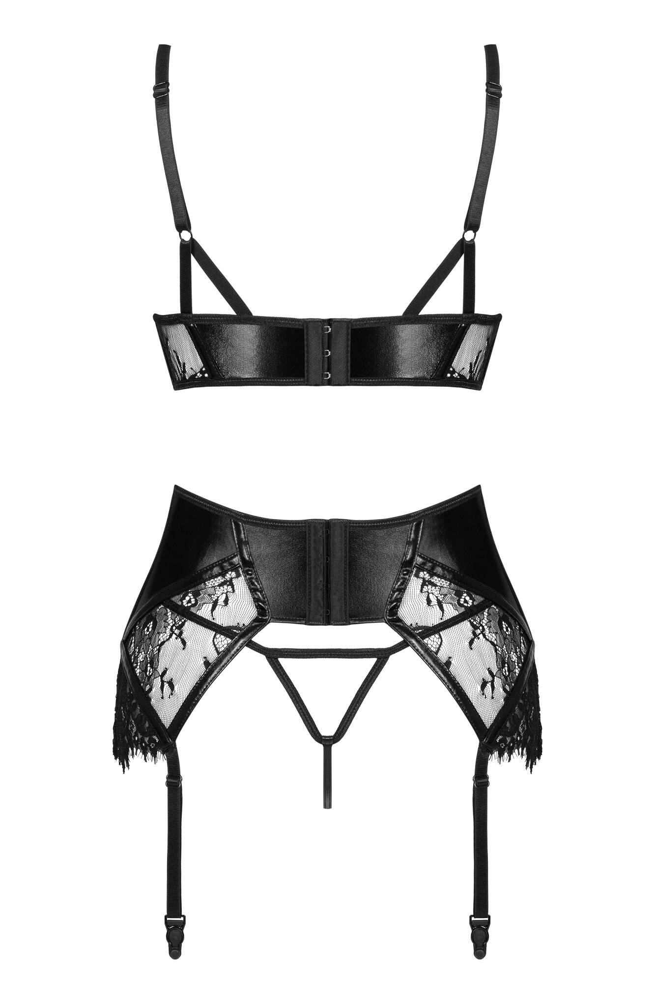 Strapse-Set aus schwarzem Tüll und Kunstleder. Der Bügel-BH und der Strumpfgürtel sind individuell einstellbar. Im Set ein passender String, ohne Strümpfe.